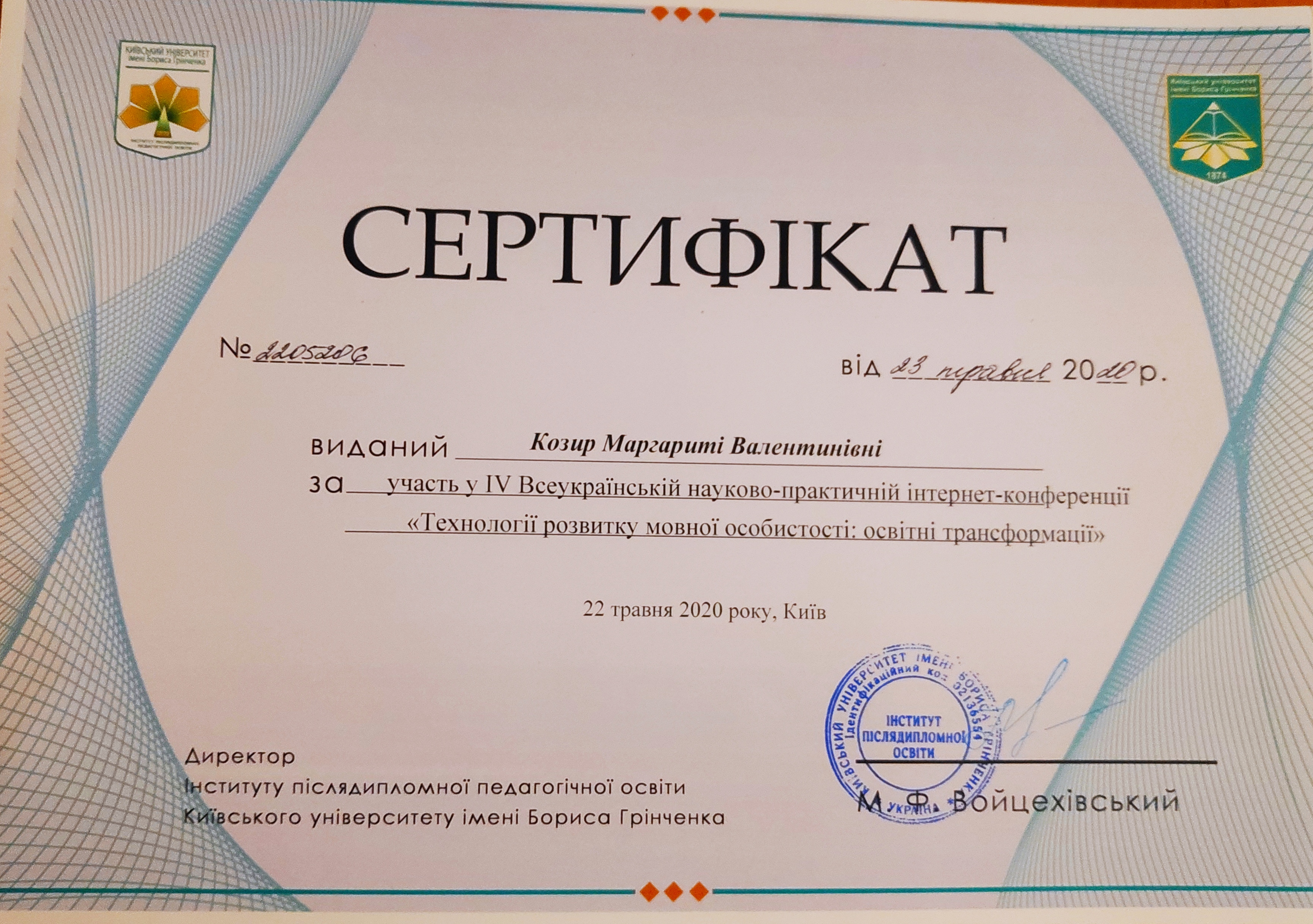 | 5520 | Технології розвитку мовної особистості: освітні трансформації | Інформаційні технології: виклики часу до мовної особистості викладача | Інститут післядипломної освіти Університета Грінченка |