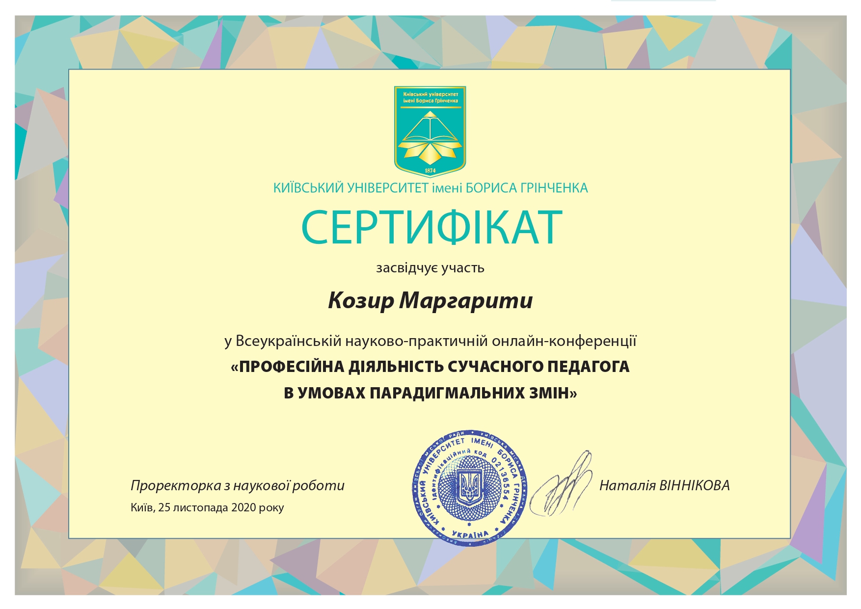 | 5861 | «ПРОФЕСІЙНА ДІЯЛЬНІСТЬ СУЧАСНОГО ПЕДАГОГА В УМОВАХ ПАРАДИГМАЛЬНИХ ЗМІН» | "Інформаційна педагогіка в умовах НУШ" | Педагогічний інститут Київського університету імені Бориса Грінченка |