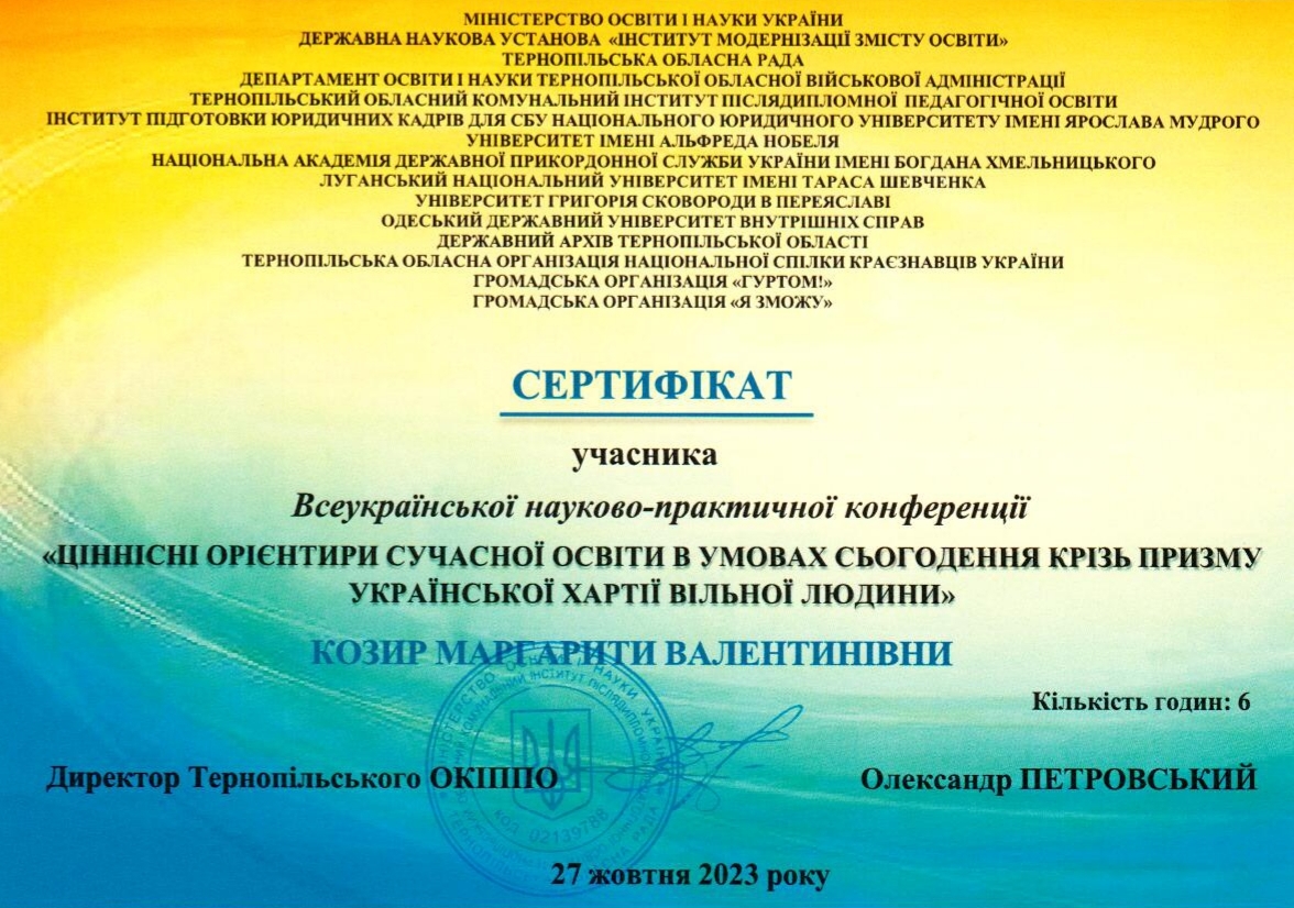 | 10805 | «УКРАЇНСЬКА ХАРТІЯ ВІЛЬНОЇ ЛЮДИНИ: ВІД СМИСЛОВИХ КОНСТРУКТІВ ДО ФОРМУВАННЯ СИСТЕМИ ЦІННОСТЕЙ» | ТРАНСФОРМАЦІЯ ЦІННІСНИХ ОРІЄНТИРІВ В УМОВАХ ВІЙНИ: КОНСУЛЬТАТИВНА ДІЯЛЬНІСТЬ В ОСВІТІ ДОРОСЛИХ | м.Тернопіль | document.pdf | |