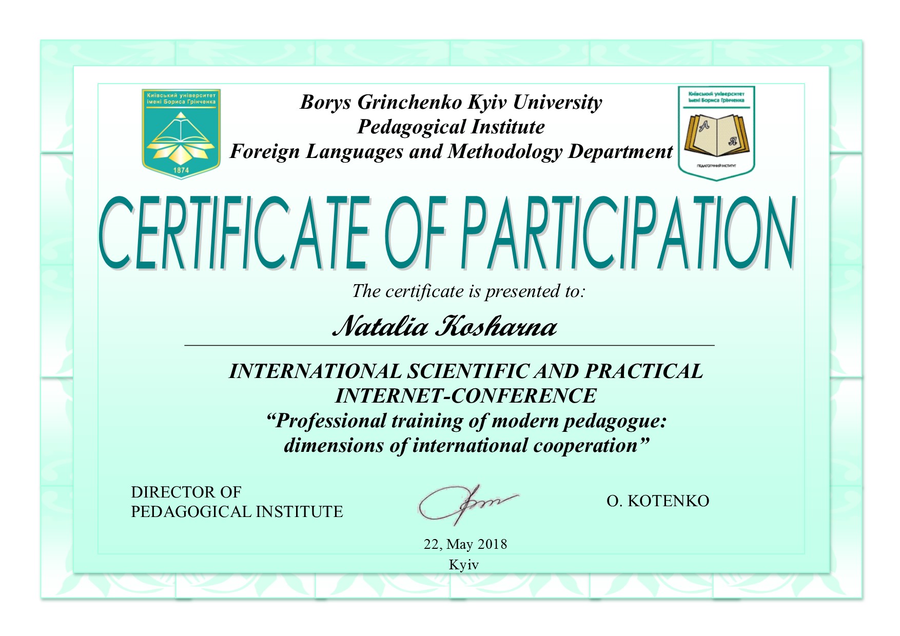 | 4055 | International Conference TEACHING FOREIGN LANGUAGES IN UKRAINE AND BEYOND: BEST PRACTICES AND CHALLENGES | Роль іншомовної освіти у формуванні навичок критичного мислення дітей молодшого шкільного віку | Precarpathian National University, Ivano-Frankivsk City, Ukraine |