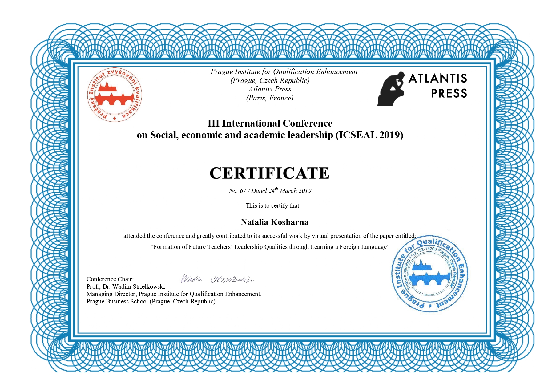 | 4438 | III International Conference on Social, economic and academic leadership (ICSEAL 2019) | Formation of Future Teachers’ Leadership Qualities through Learning a Foreign Language | Prague, Czech Republic |