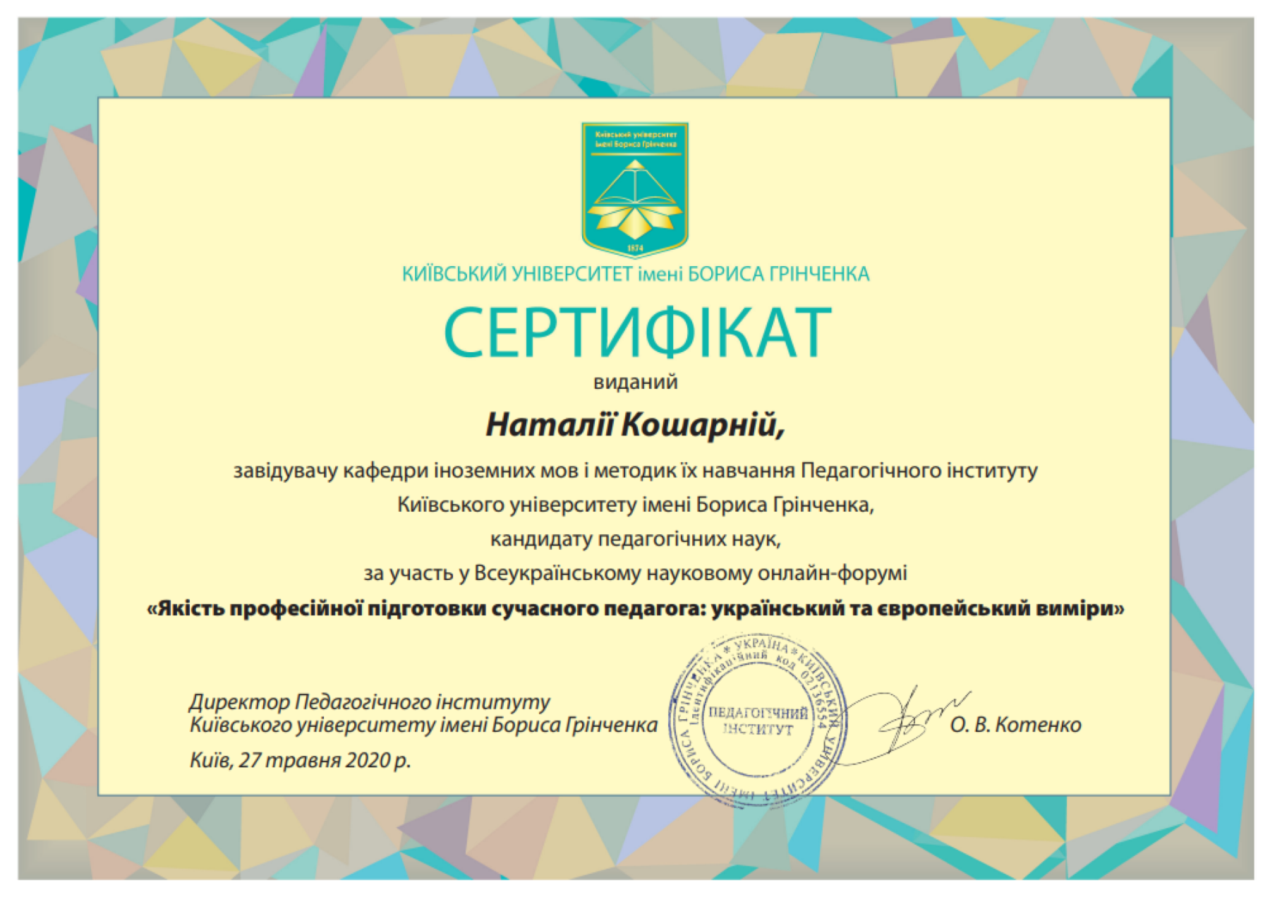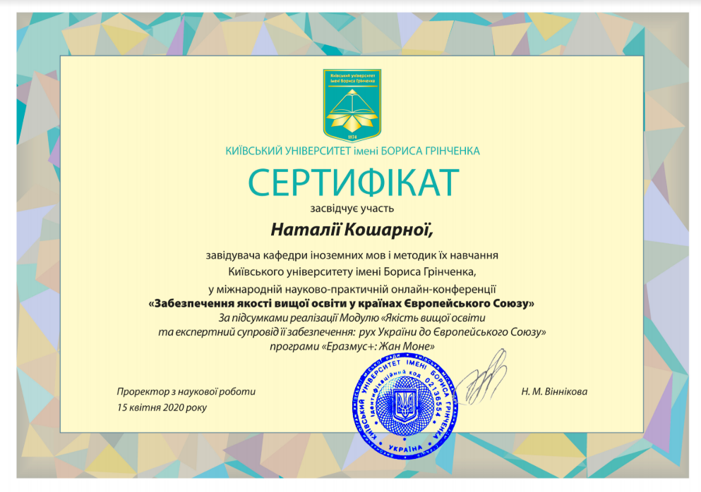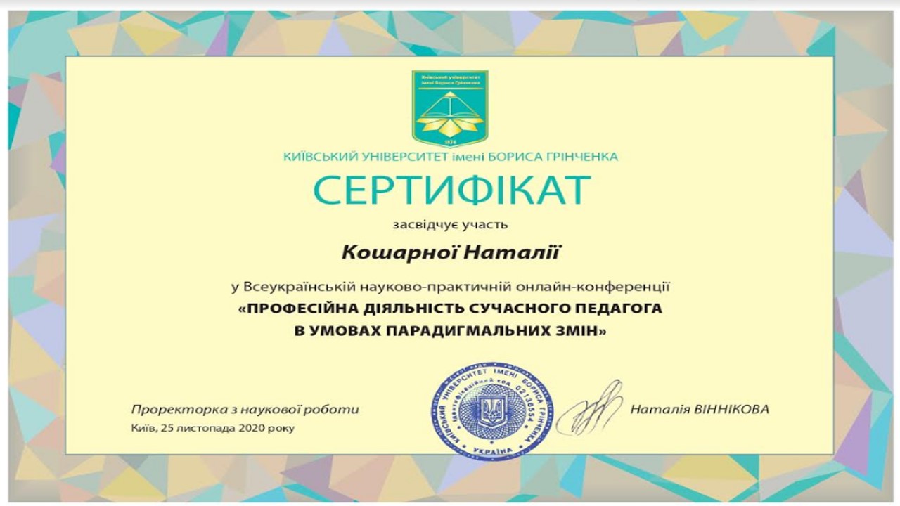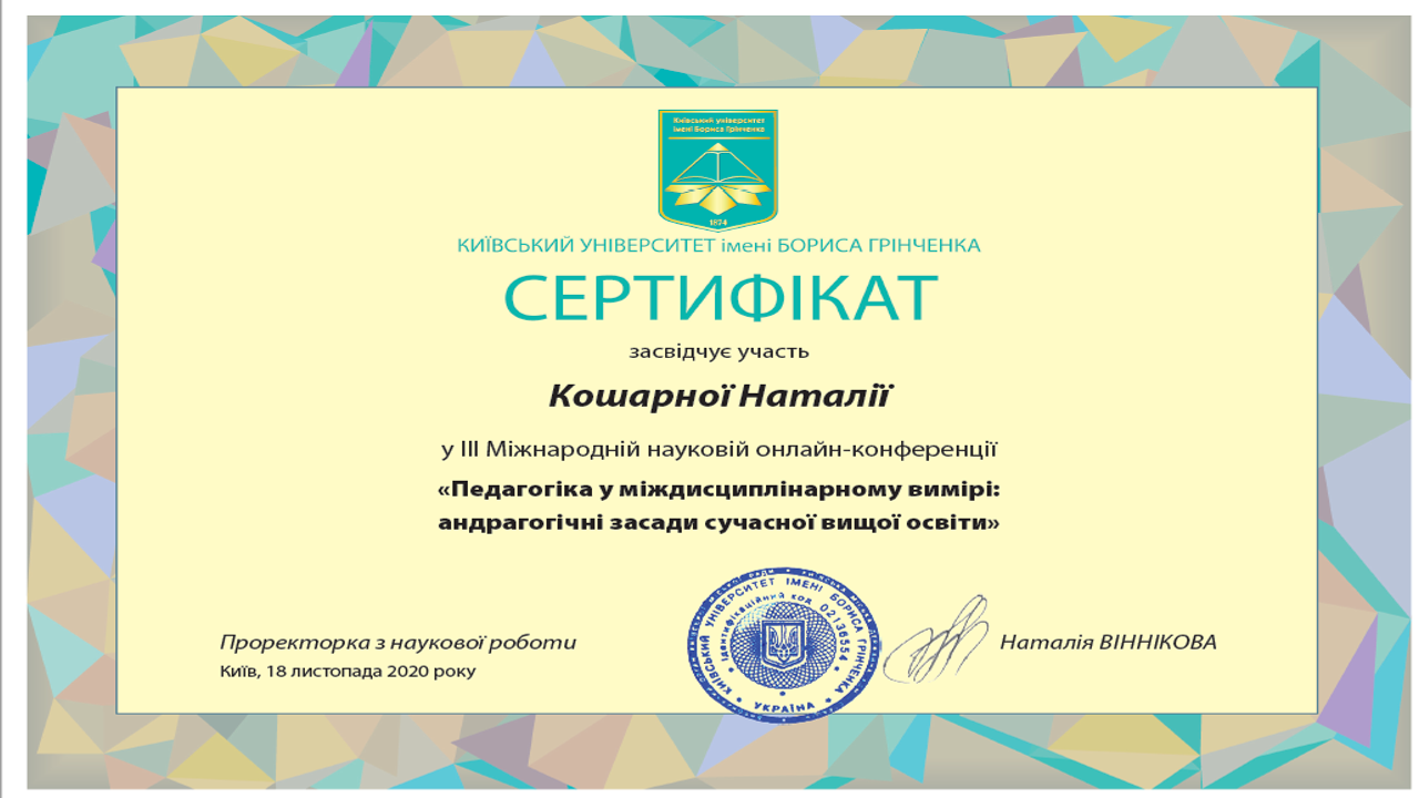 | 5898 | Всеукраїнська науково-практична онлайн-конференція "Професійна діяльність сучасного педагога в умовах парадигмальних змін" | Розвиток критичного мислення сучасного вчителя іноземної мови | Київський університет імені Бориса Грінченка |