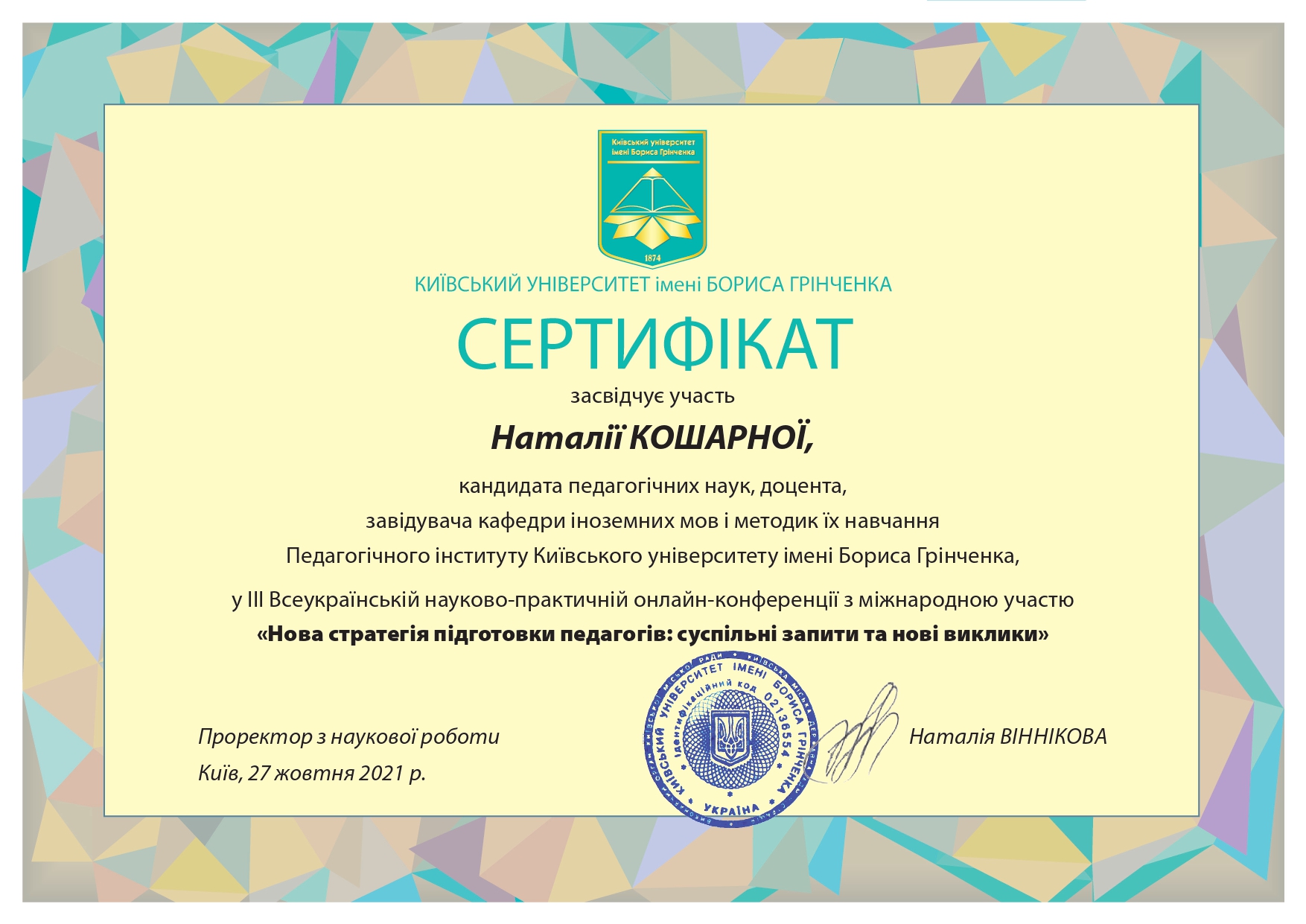 | 7186 | ІІІ Всеукраїнська науково-практична онлайн-конференція з міжнародною участю «Нова стратегія підготовки педагогів: суспільні запити та нові виклики» | Стратегія іншомовної підготовки педагога в умовах євроінтеграції | Київський університет імені Бориса Грінченка |