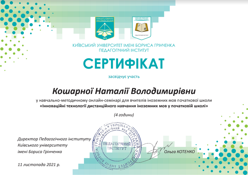 | 7377 | Навчально-методичний онлайн-семінар для вчителів іноземних мов початкової школи «Інноваційні технології дистанційного навчання іноземних мов у початковій школі» | - | Педагогічний інститут, Київський університет імені Бориса Грінченка |