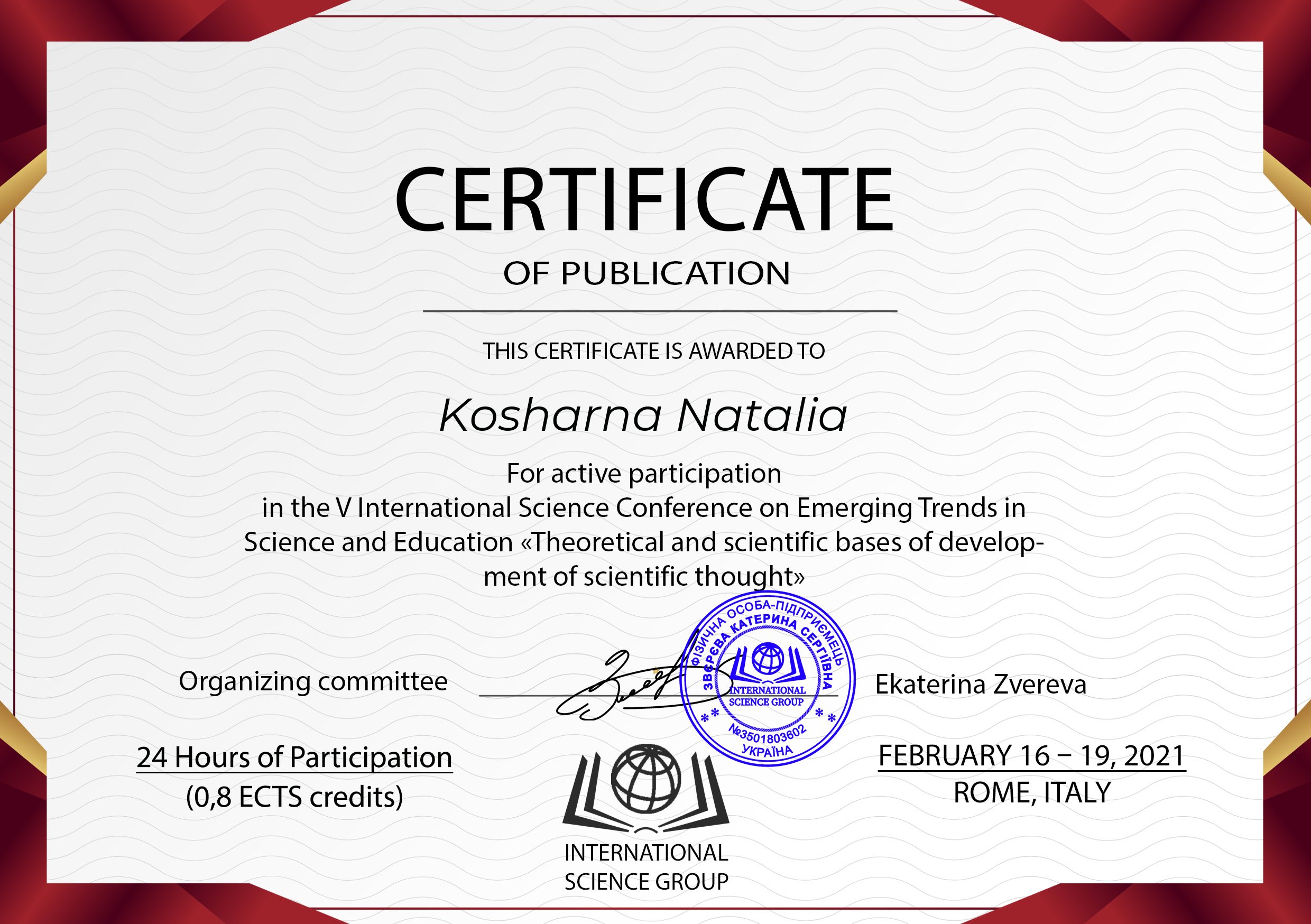 | ID | Назва | Тема доповіді | Місце проведення | Документ, що засвідчує | Дата проведення |