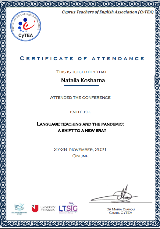| 7716 | CyTEA's Αnnual Conference \ | Teachers’ views on language teaching in the era of enriched language classrooms and online lessons: a study in Greece and in Ukraine | Cyprus |