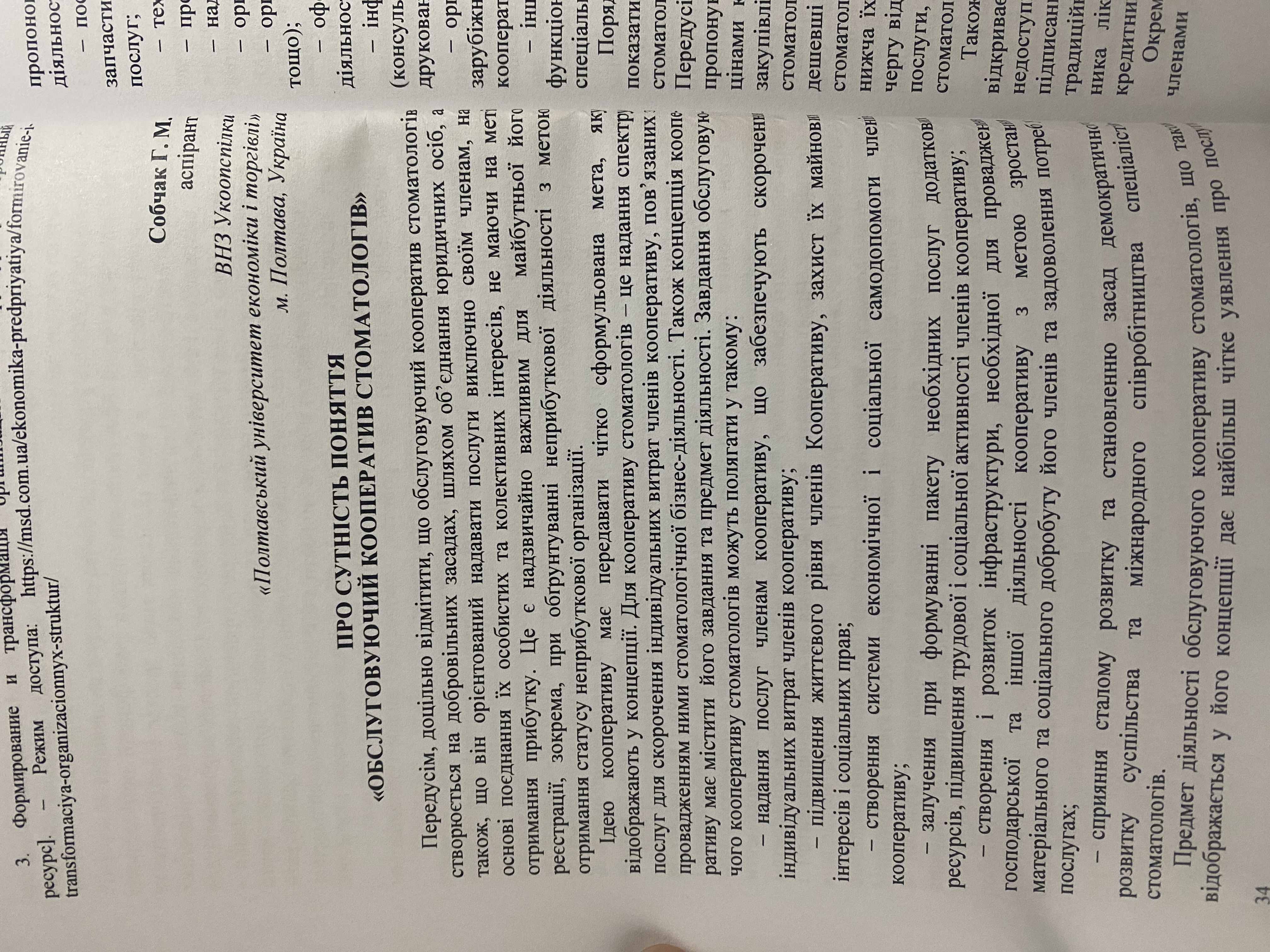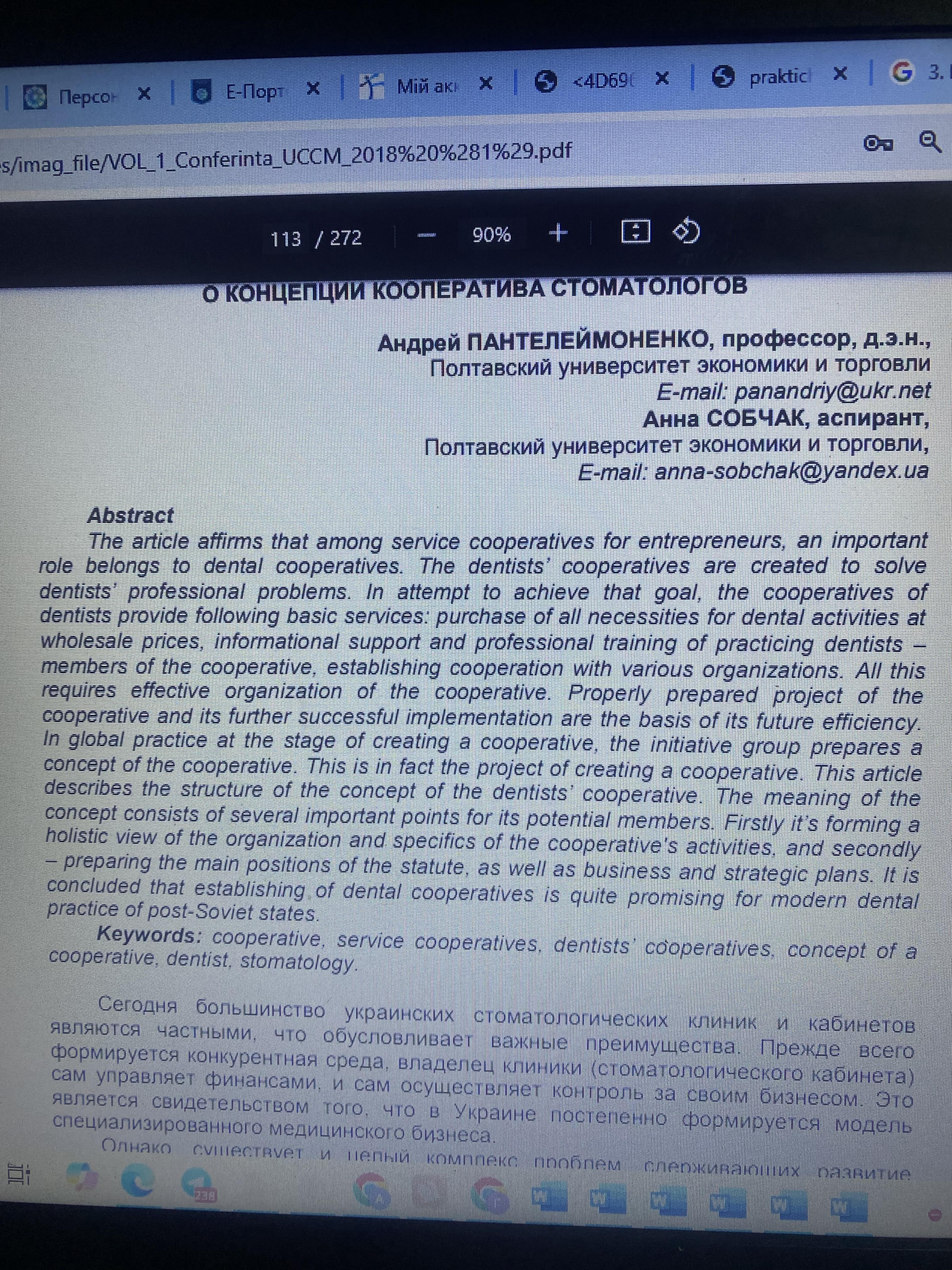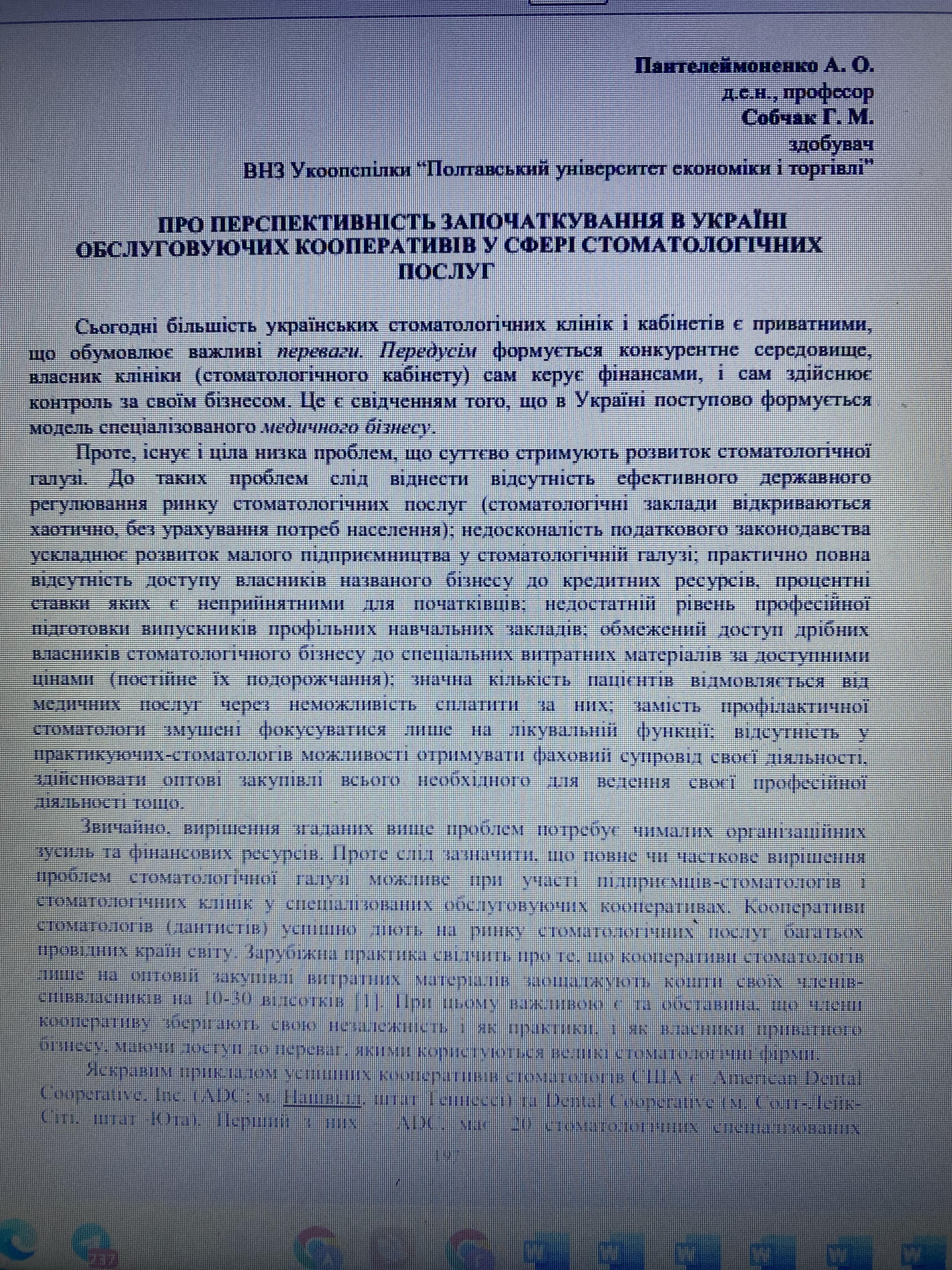 | 10909 | ПЕРСПЕКТИВНІ НАПРЯМИ РОЗВИТКУ НАЦІОНАЛЬНОЇ ЕКОНОМІКИ В УМОВАХ ЗМІН РИНКОВОГО СЕРЕДОВИЩА: ПРОБЛЕМИ ТА ПЕРСПЕКТИВИ | ПРО СУТНІСТЬ ПОНЯТТЯ «ОБСЛУГОВУЮЧИЙ КООПЕРАТИВ СТОМАТОЛОГІВ | Одеса |