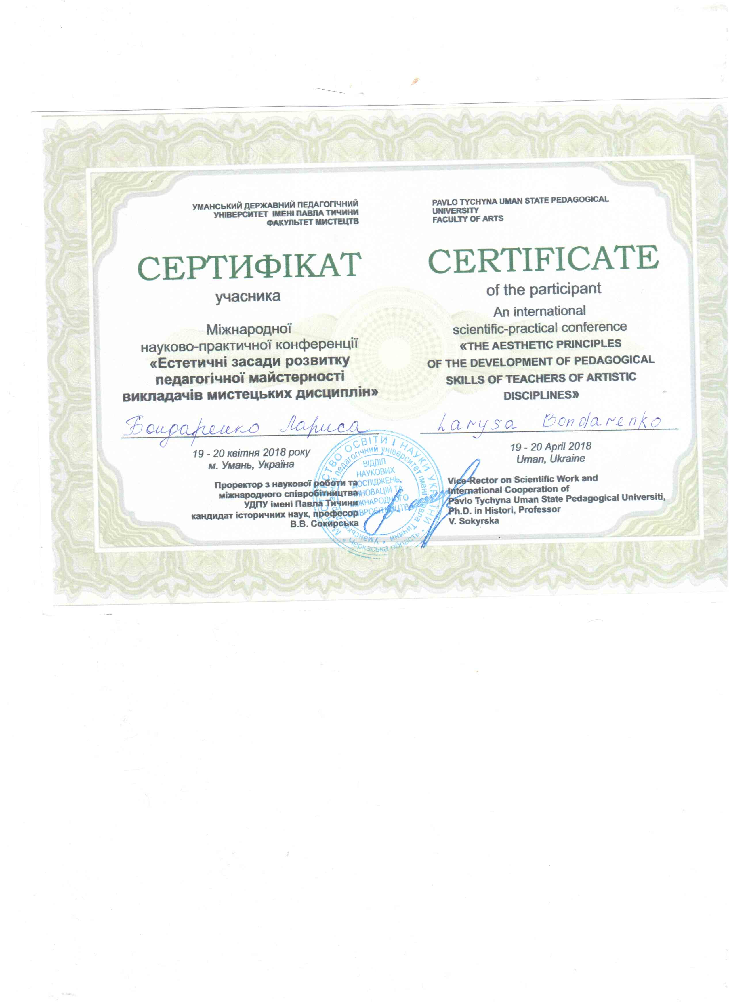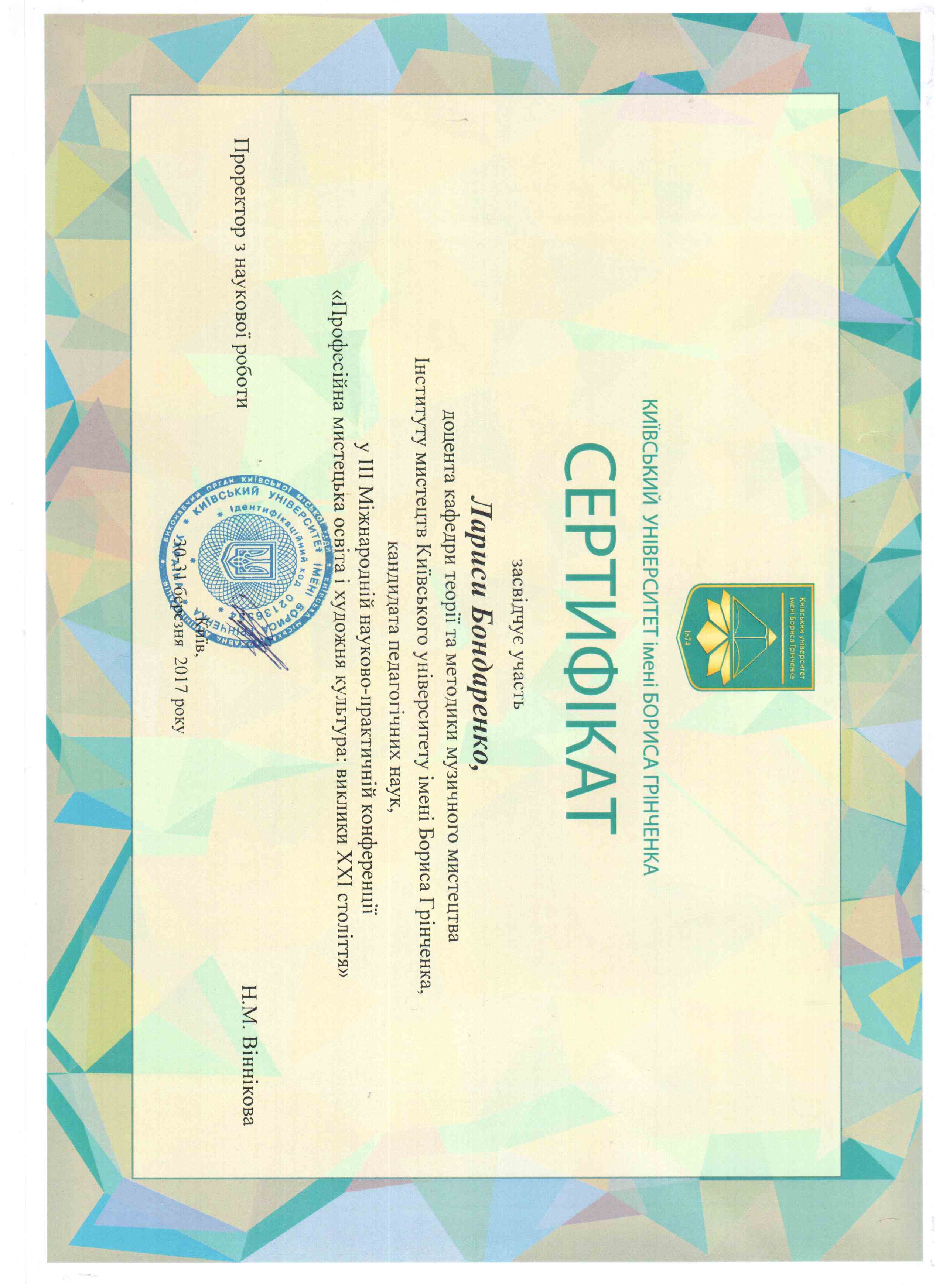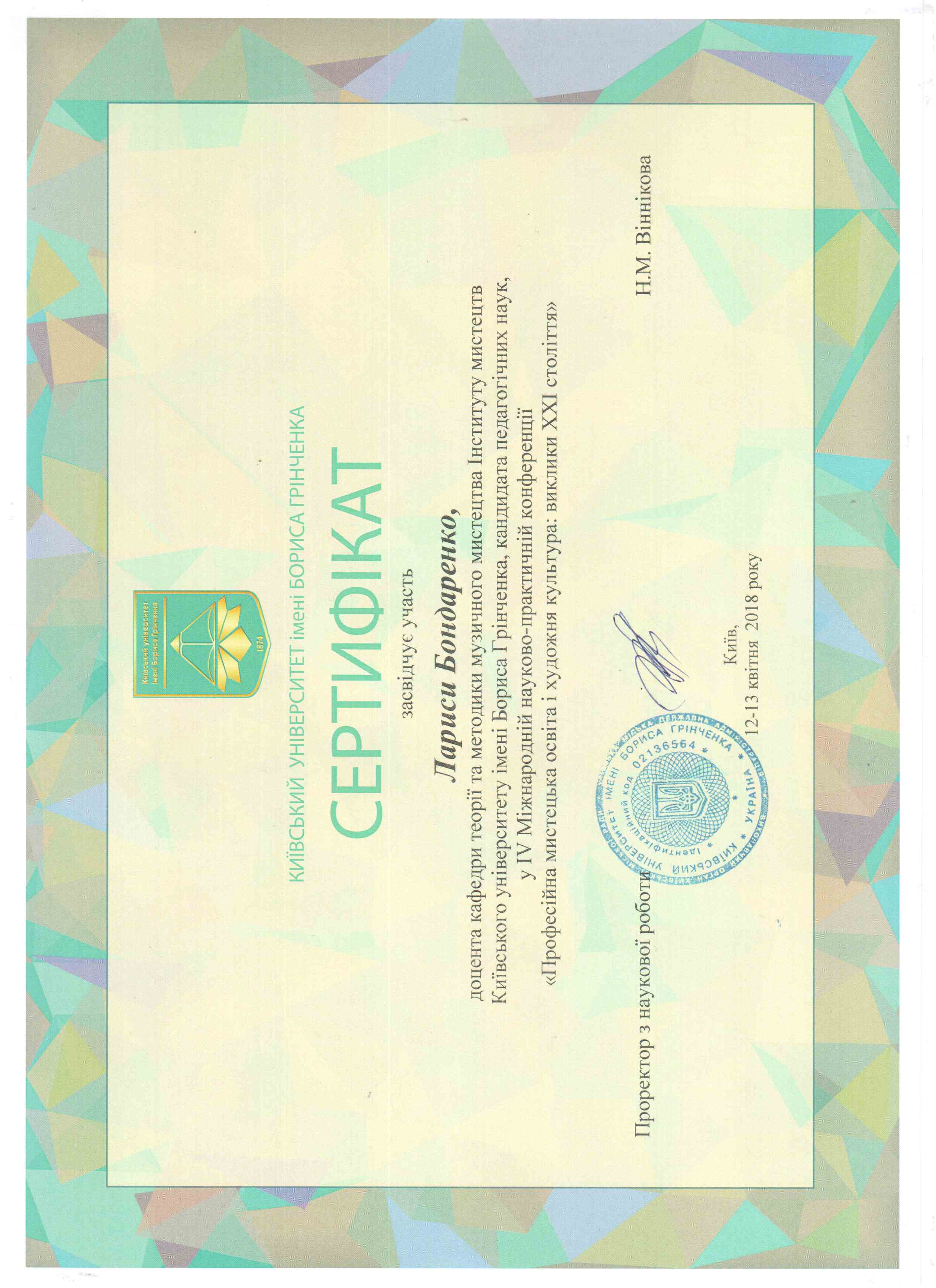 | 478 | ІІ Міжнародна науково-практична конференція "Професійна мистецька освіта і художня культура: виклики ХХІ століття" Секція "Іннов | Міжнародна конференція | Київський університет імені Бориса Грінченка | 15.04.2016 00:00 | 5 |
