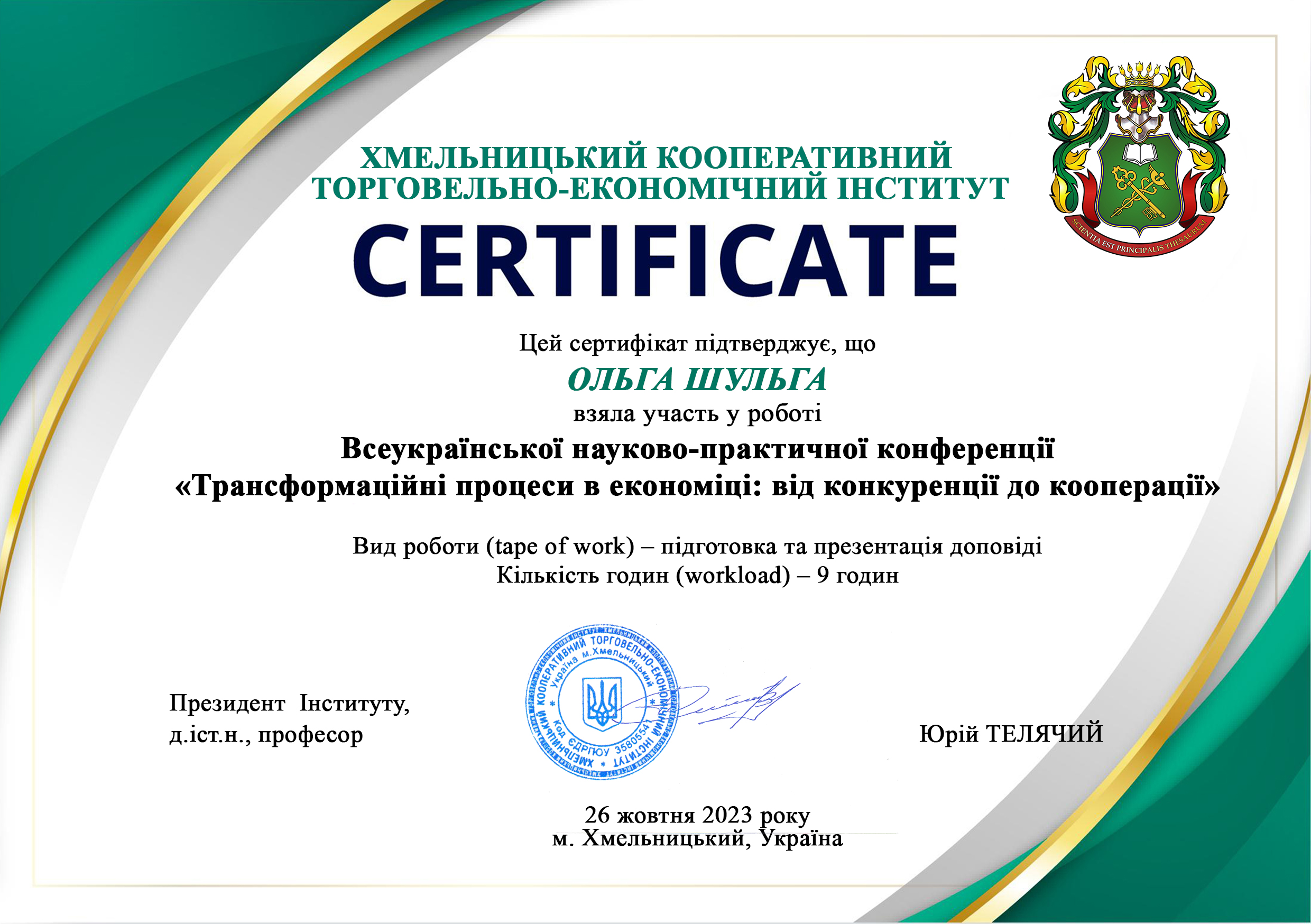 - З 01.03.2025 року - і по цей час - член Всеукраїнської асоціації економістів-міжнародників (сертифікат №1669 від 01.03.2025 р.)