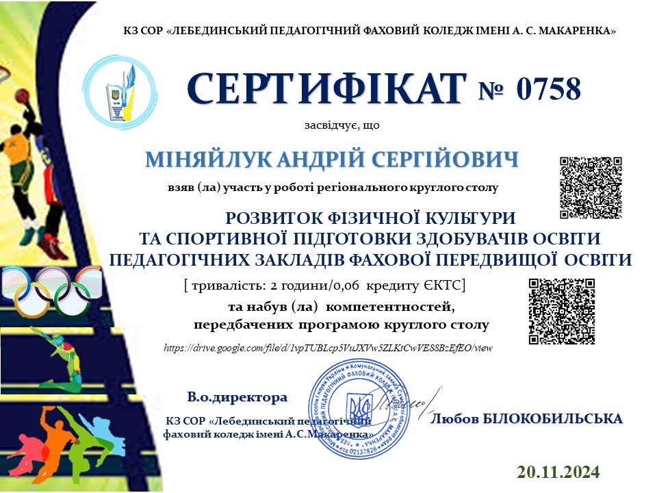 | 10797 | Розвиток фізичної культури та спортивної підготовки в закладах освіти | Інший модуль | Міняйлук.pdf | 16.04.2024 00:00 |
