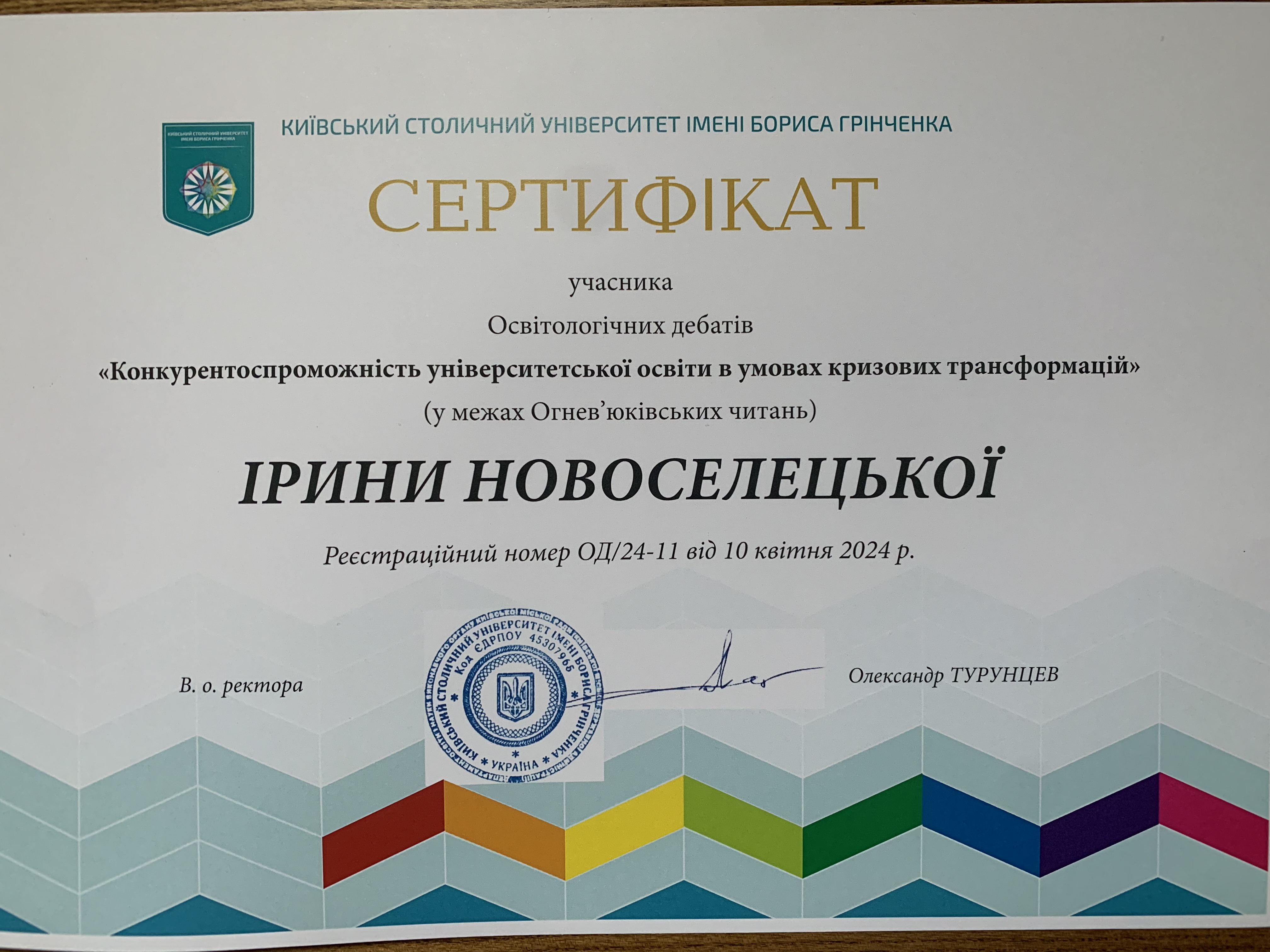 | 10498 | Всеукраїнська науково-практична онлайн-конференція \ | доповідь здобувачки освіти IV курсу «Умови роботи актора драматичного театру: український досвід в умовах воєнного стану» | Київ |