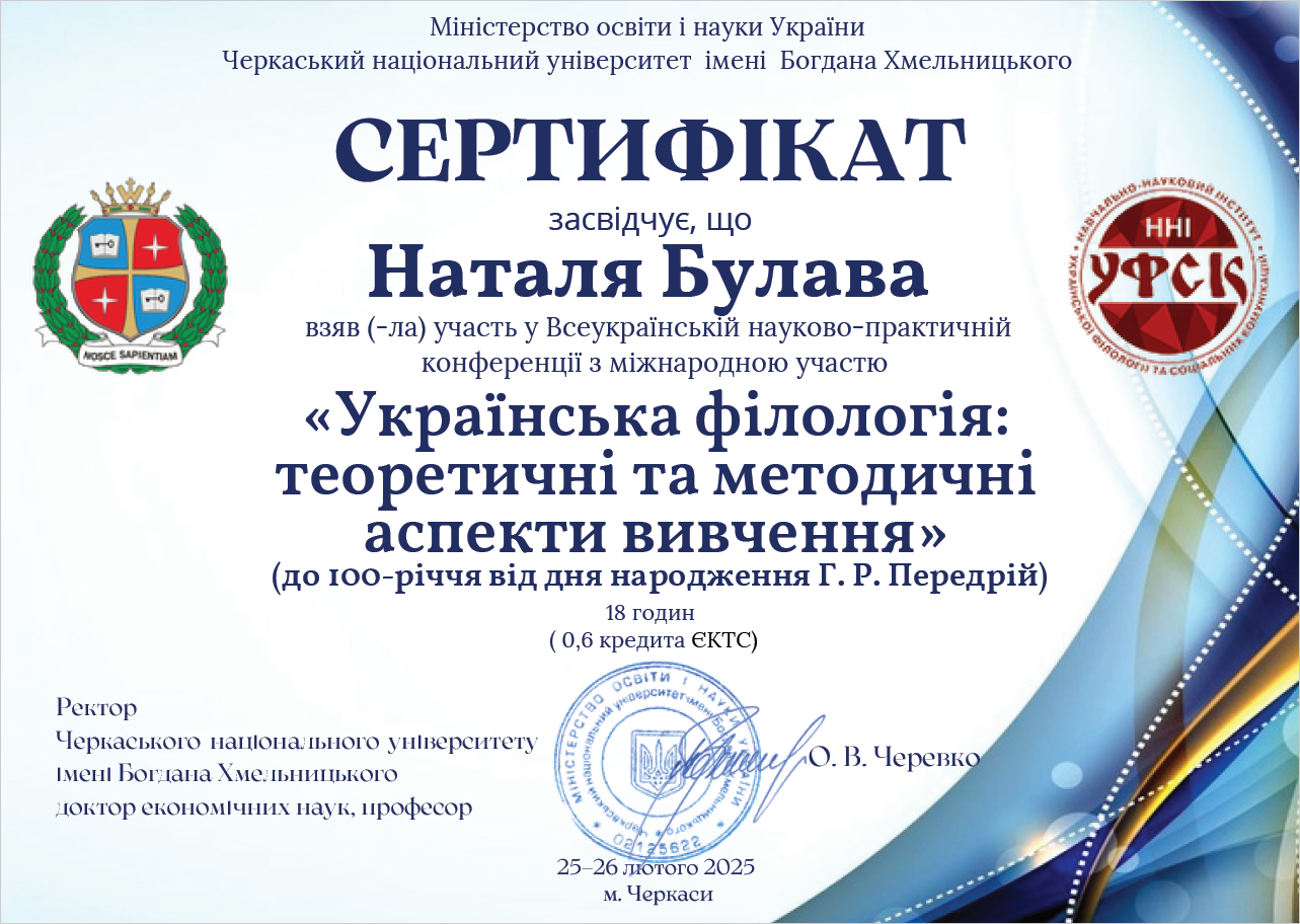 | 11827 | Українська філологія:теоретичні та методичніаспекти вивчення | Правописні особливості прізвищ у контексті мовних інновацій | Черкаський національний університет імені Богдана Хмельницького |