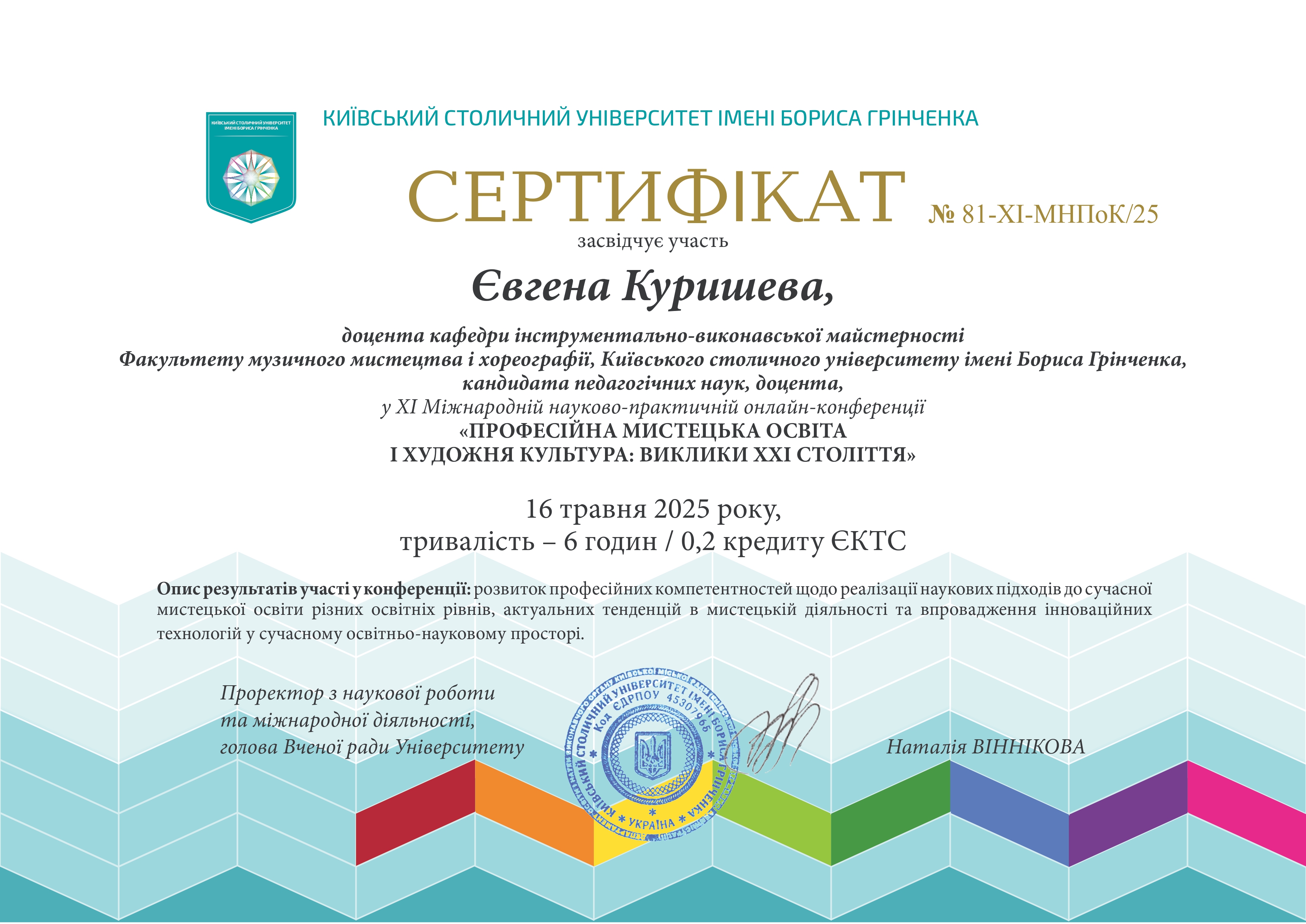 | 987 | Факультет музичного мистецтва і хореографії | Кафедра інструментально-виконавської майстерності | 1.5 | 1 | 2025 | https://www.researchgate.net/profile/Evgen-Kurisev |