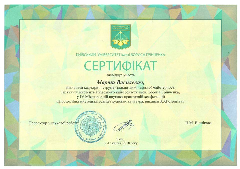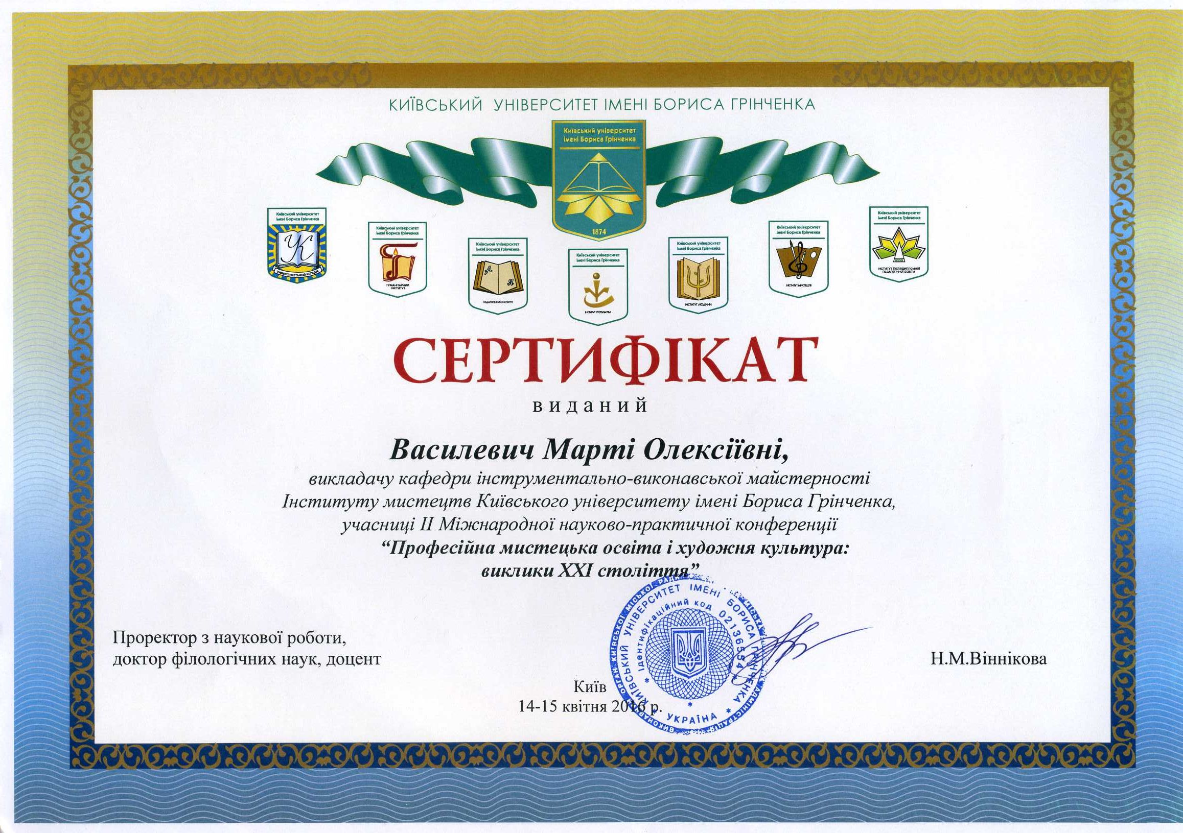 | 90 | II Міжнародна науково-практична конференція 'Професійна мистецька освіта і художня культура: виклики XXI століття' | Василевич Марта Олексіївна | Київський університет імені Бориса Грінченка |