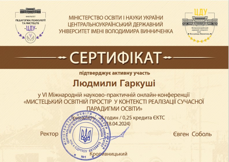 | 186 | Факультет музичного мистецтва і хореографії | Кафедра інструментально-виконавської майстерності | 2.7 | 1 | 2025 | https://www.researchgate.net/profile/Lyudmila_Harkusha |