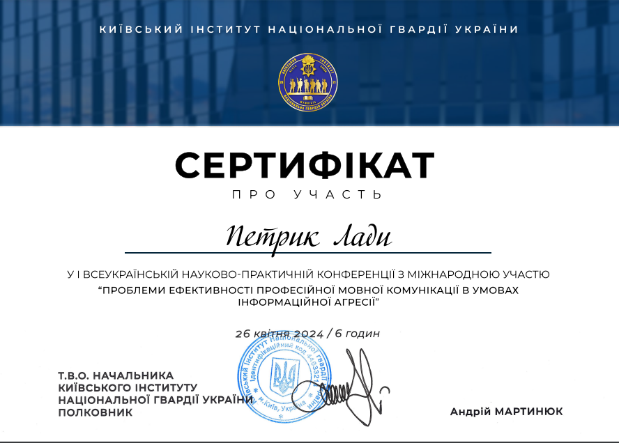 | ID | Назва | Тема доповіді | Місце проведення | Документ, що засвідчує | Дата проведення |