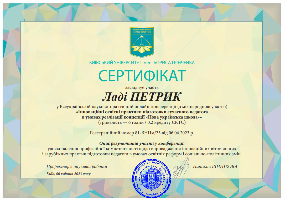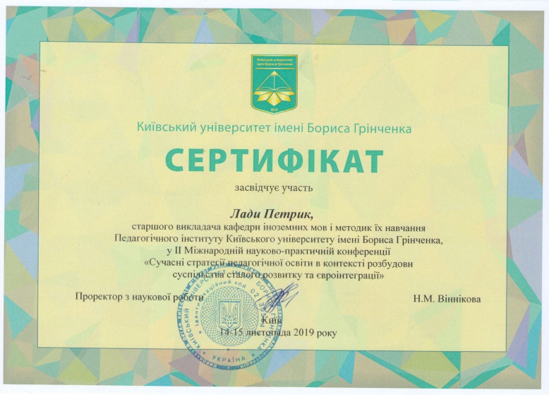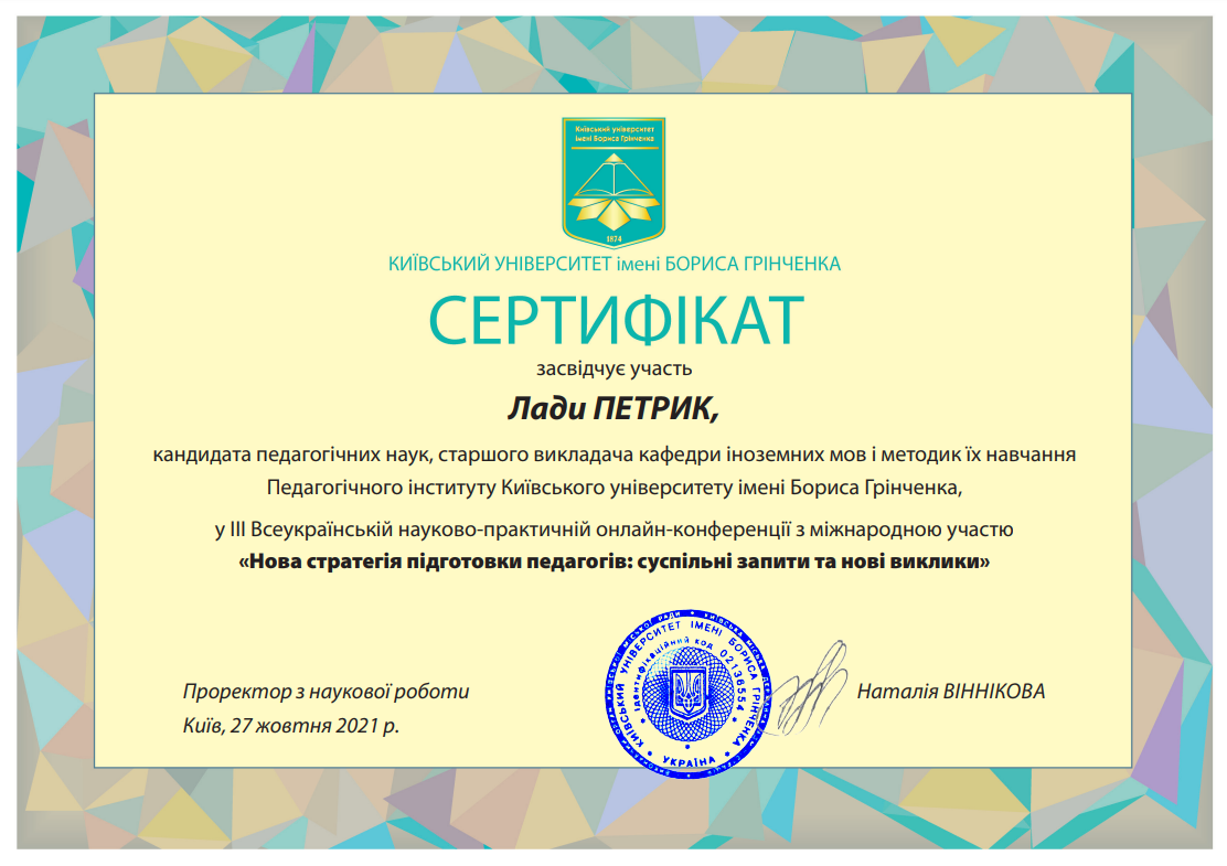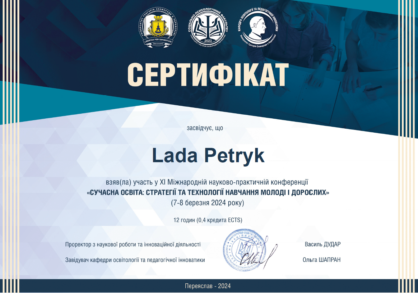 | 11162 | XІ Міжнародної науково-практичної конференції «Сучасна освіта: стратегії та технології навчання молоді і дорослих» | - | м.Переяслав |