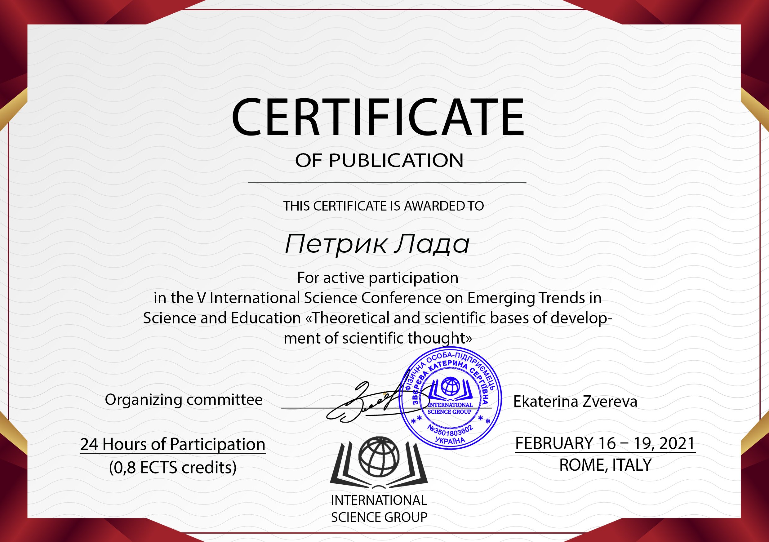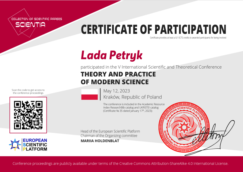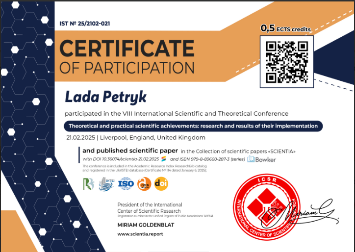| 6522 | Theoretical and scientific bases of development of scientific thought | Медіазасоби у підготовці майбутніх учителів початкової школи: поняття та сутність | Rome, Italy (online) |