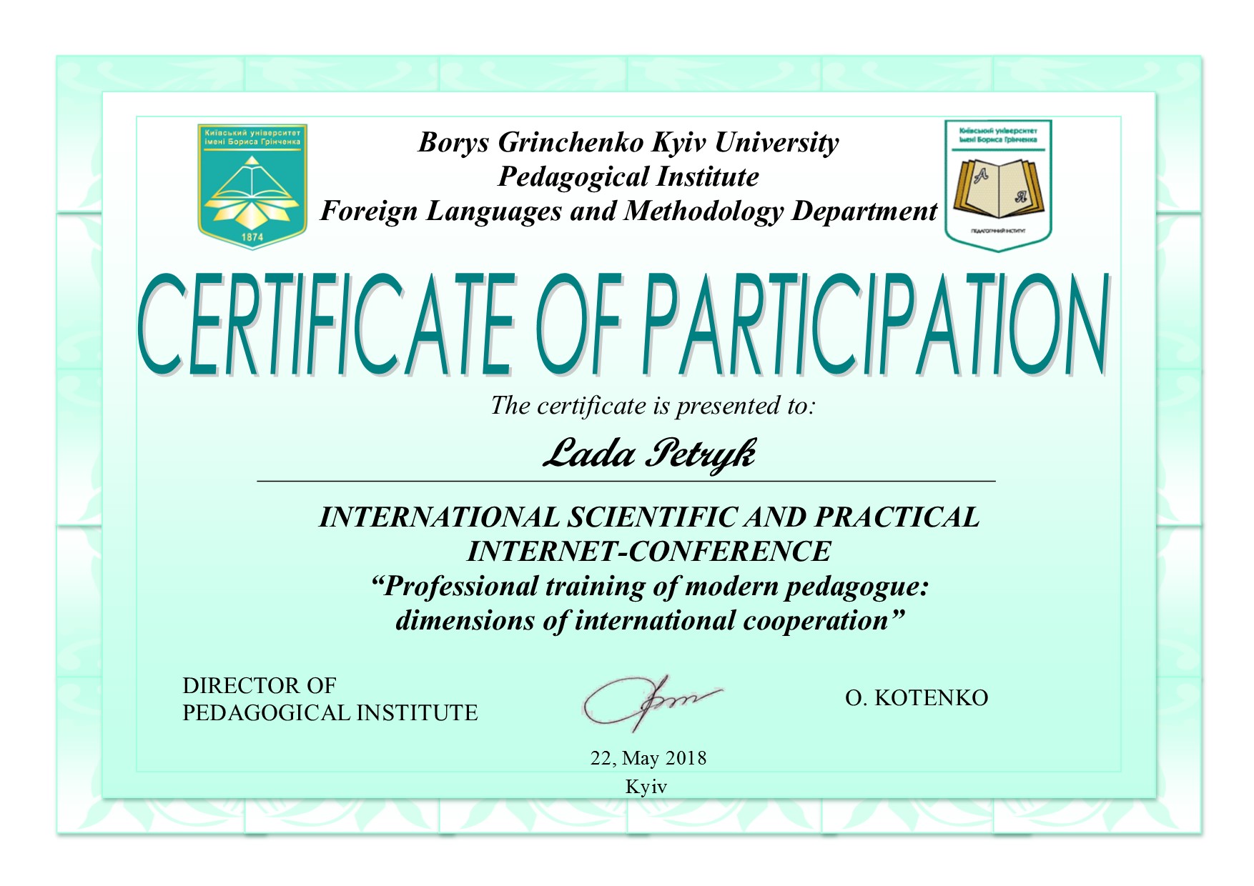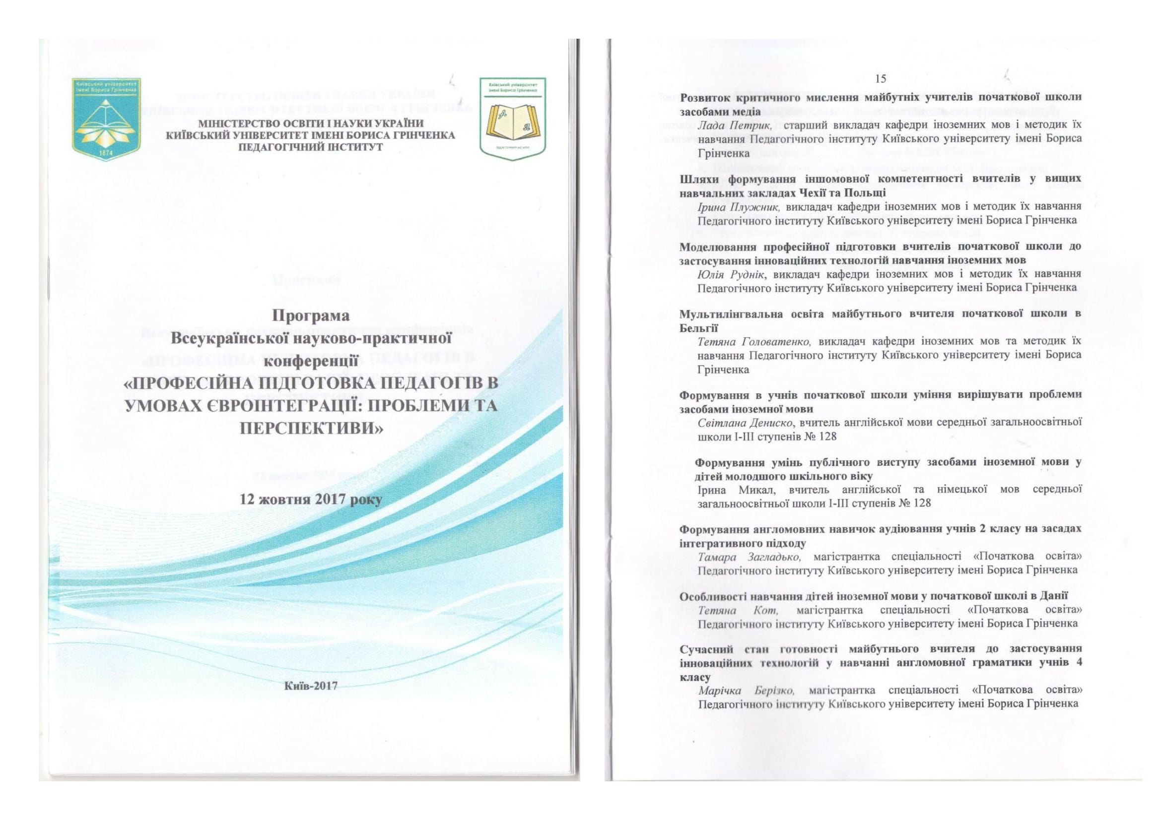 | 3608 | Професійна підготовка сучасного педагога: виміри міжнародної взаємодії | ІНТЕГРАЦІЯ МЕДІАОСВІТИ В ІНШОМОВНУ ПІДГОТОВКУ МАЙБУТНІХ УЧИТЕЛІВ ПОЧАТКОВОЇ ШКОЛИ | Київський університет імені Бориса Грінченка |