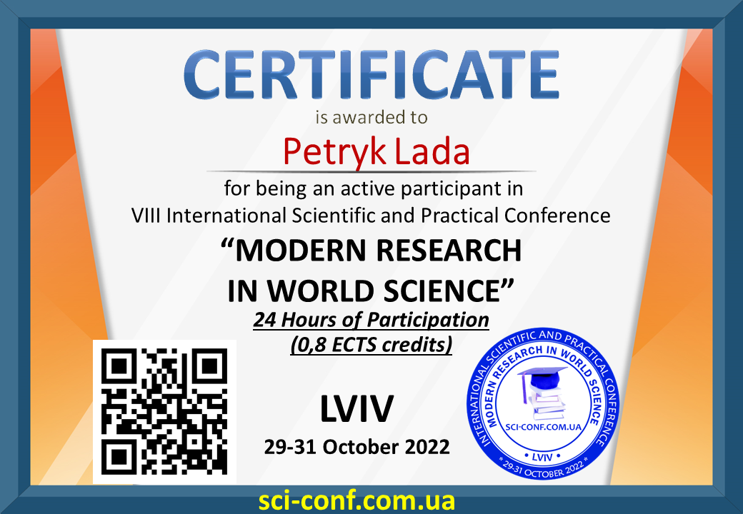 | 8371 | MODERN RESEARCH IN WORLD SCIENCE | ФОРМУВАННЯ МЕДІАГРАМОТНОСТІ УЧНІВ 4 КЛАСУ НА УРОКАХ АНГЛІЙСЬКОЇ МОВИ НОВОЇ УКРАЇНСЬКОЇ ШКОЛИ | Львів |