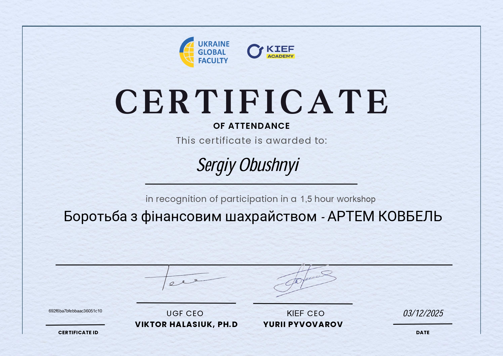 | 12688 | Семінар «Боротьба з фінансовим шахрайством» | Боротьба з фінансовим шахрайством | Український глобальний факультет (Ukraine Global Faculty) |