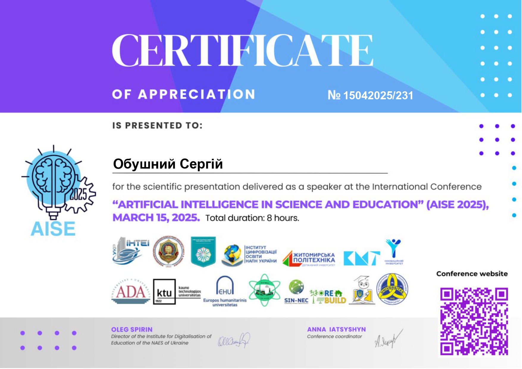 | ID | Назва | Тема доповіді | Місце проведення | Документ, що засвідчує | Дата проведення |