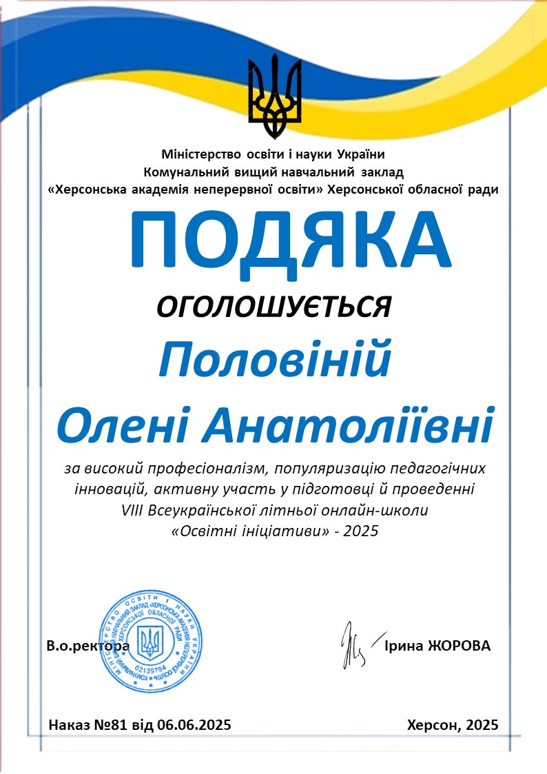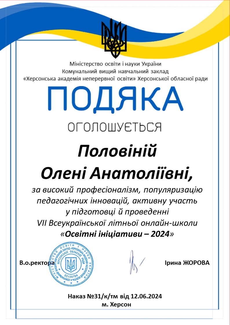 5. Спікер Всеукраїнської Літньої онлайн-школи «Освітні ініціативи» – 2024, тема «Артгра й дитина: відкриваємо два світи – краси і свого Я», Херсон, 7 червня 2024 року