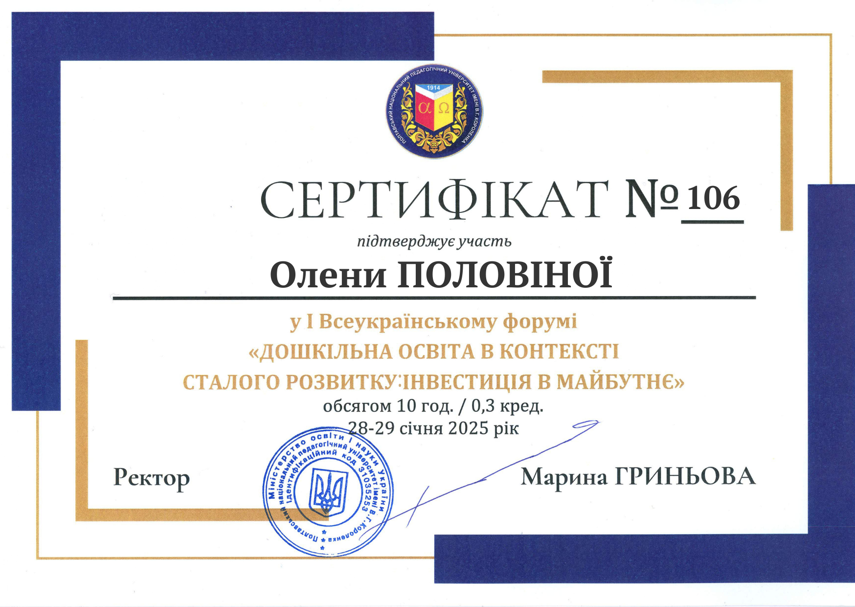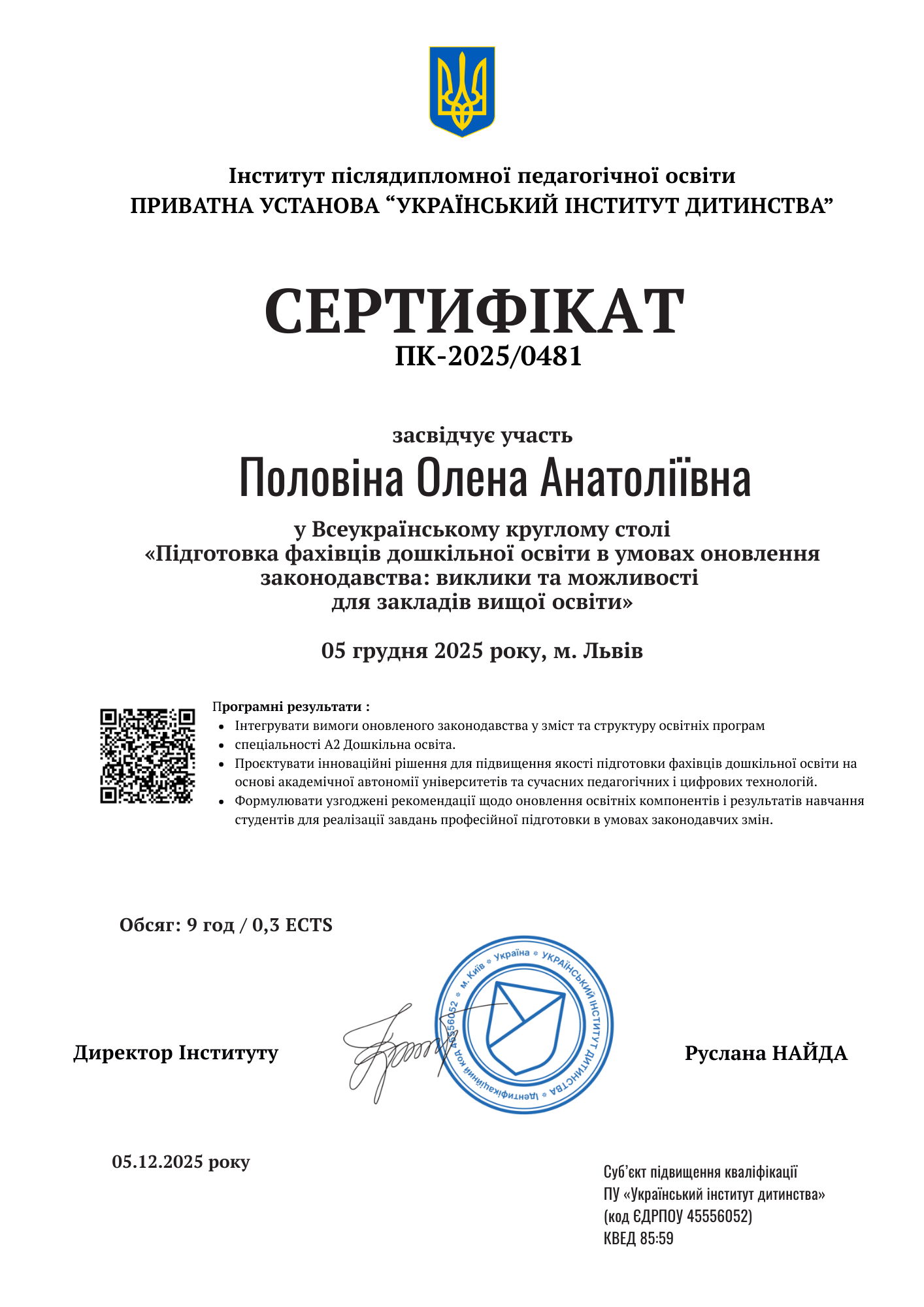 1. Голова експертної комісії К01 з дошкільної педагогіки та психології Наказ МОНУ від 20.11.2024 № 1636.