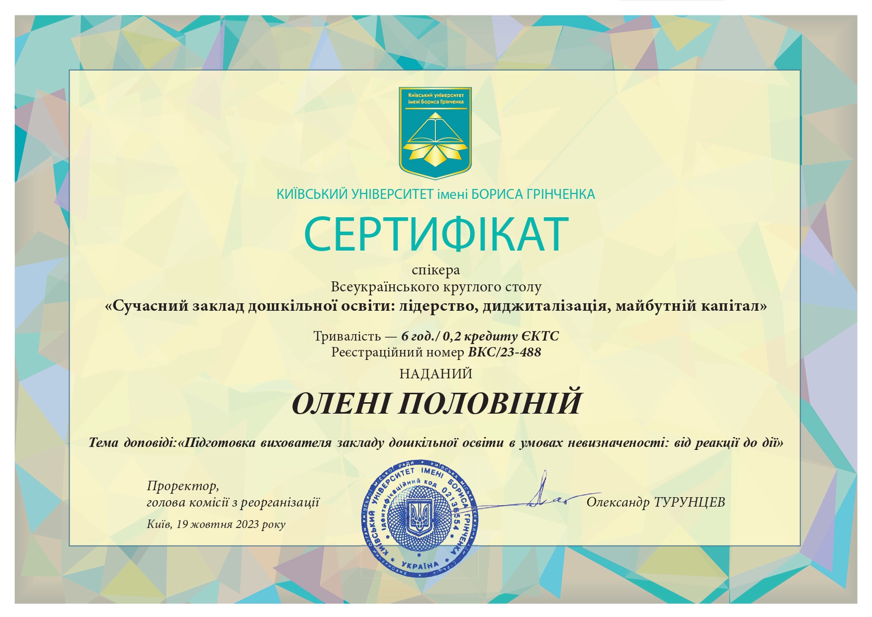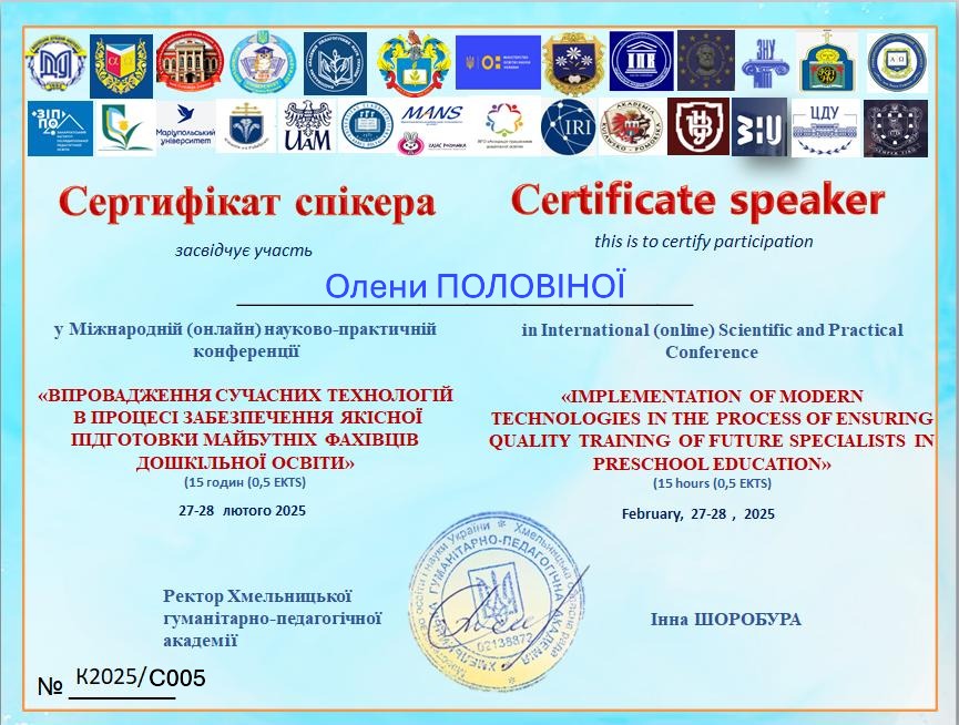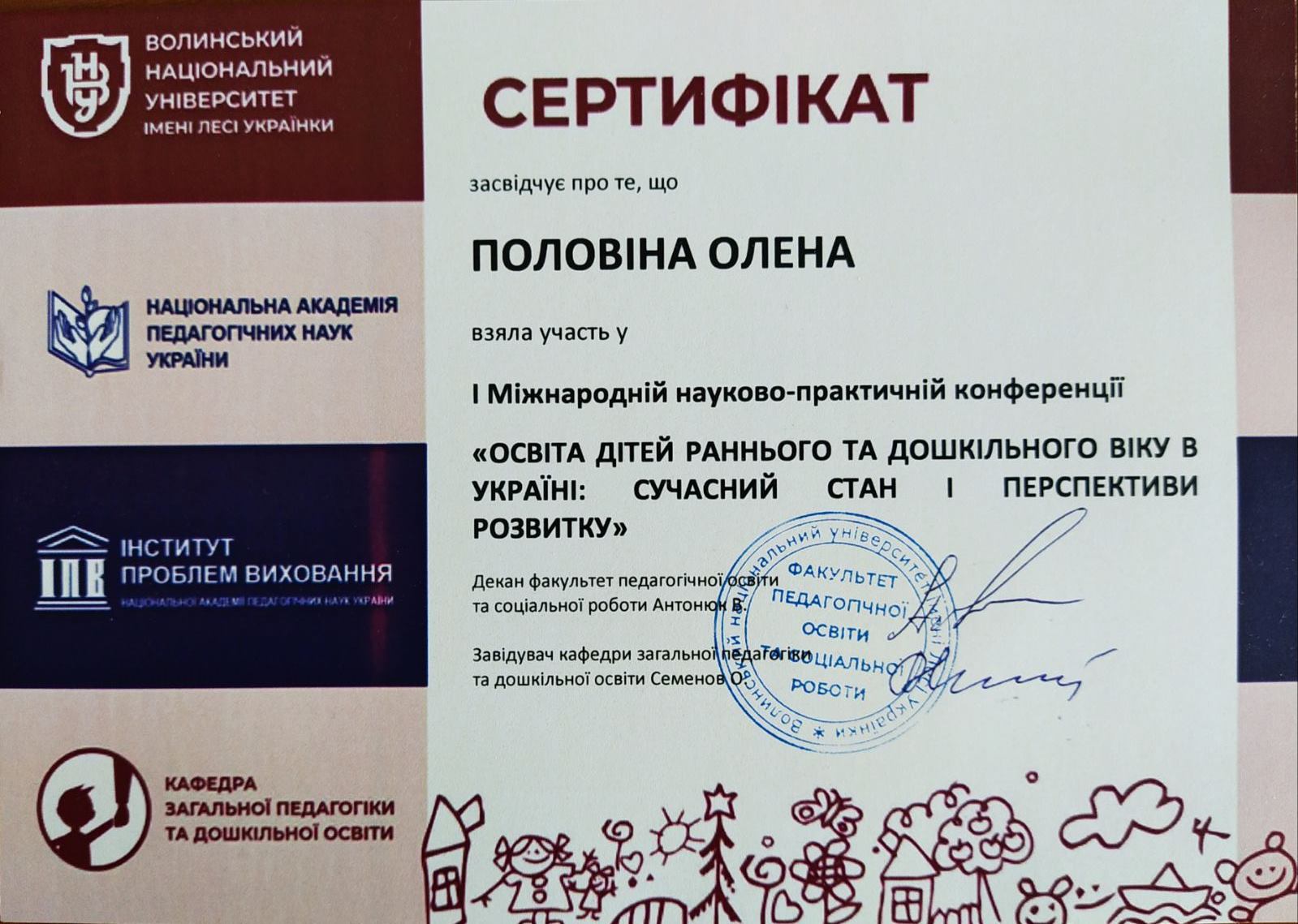 1. Спікер Всеукраїнського вебінару «Використання інноваційних технологій у взаємодії з дітьми дошкільного віку» м. Київ, 29 березня 2023 р. Тема «Технологія образотворення – залюблення дітей у красу»