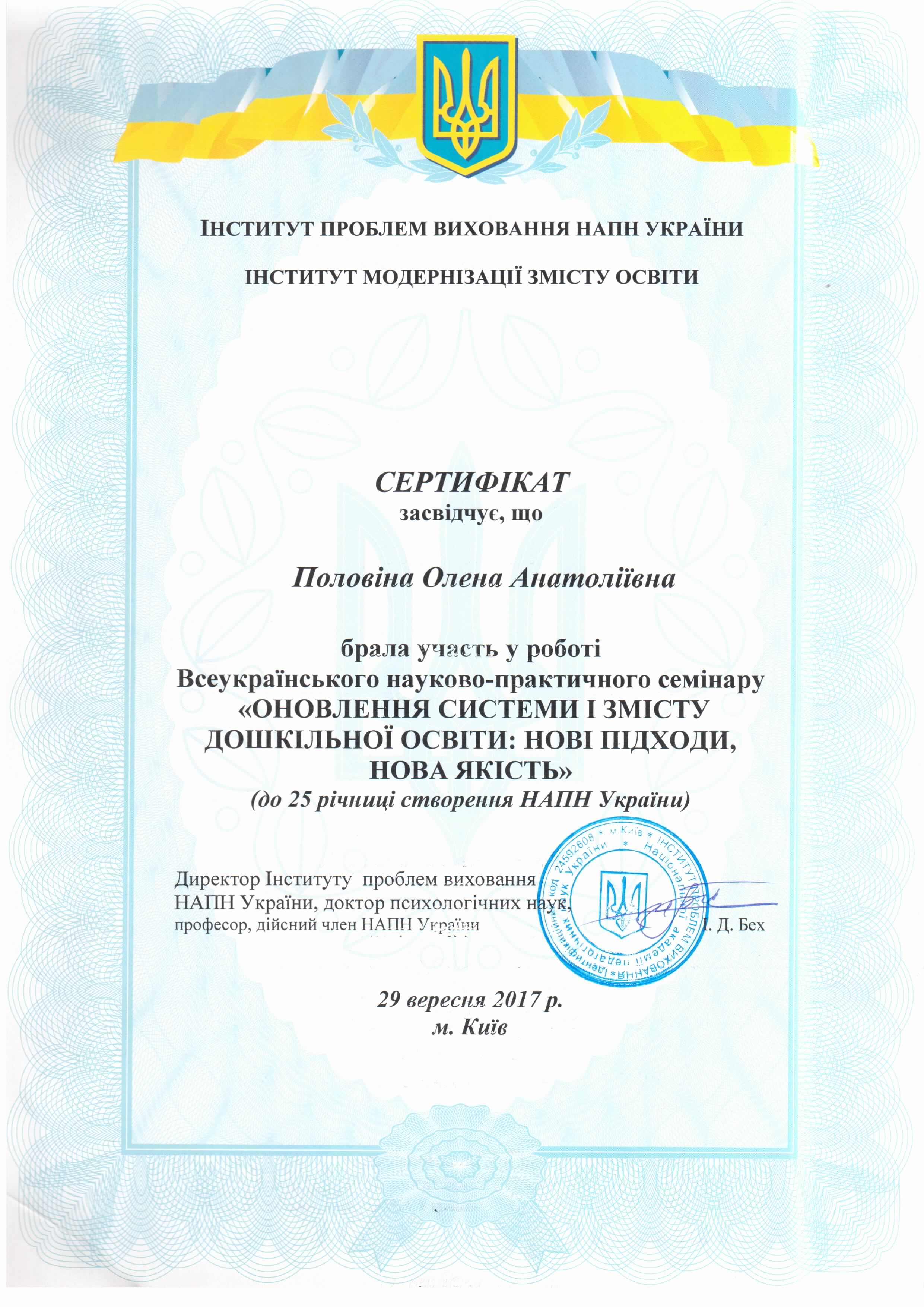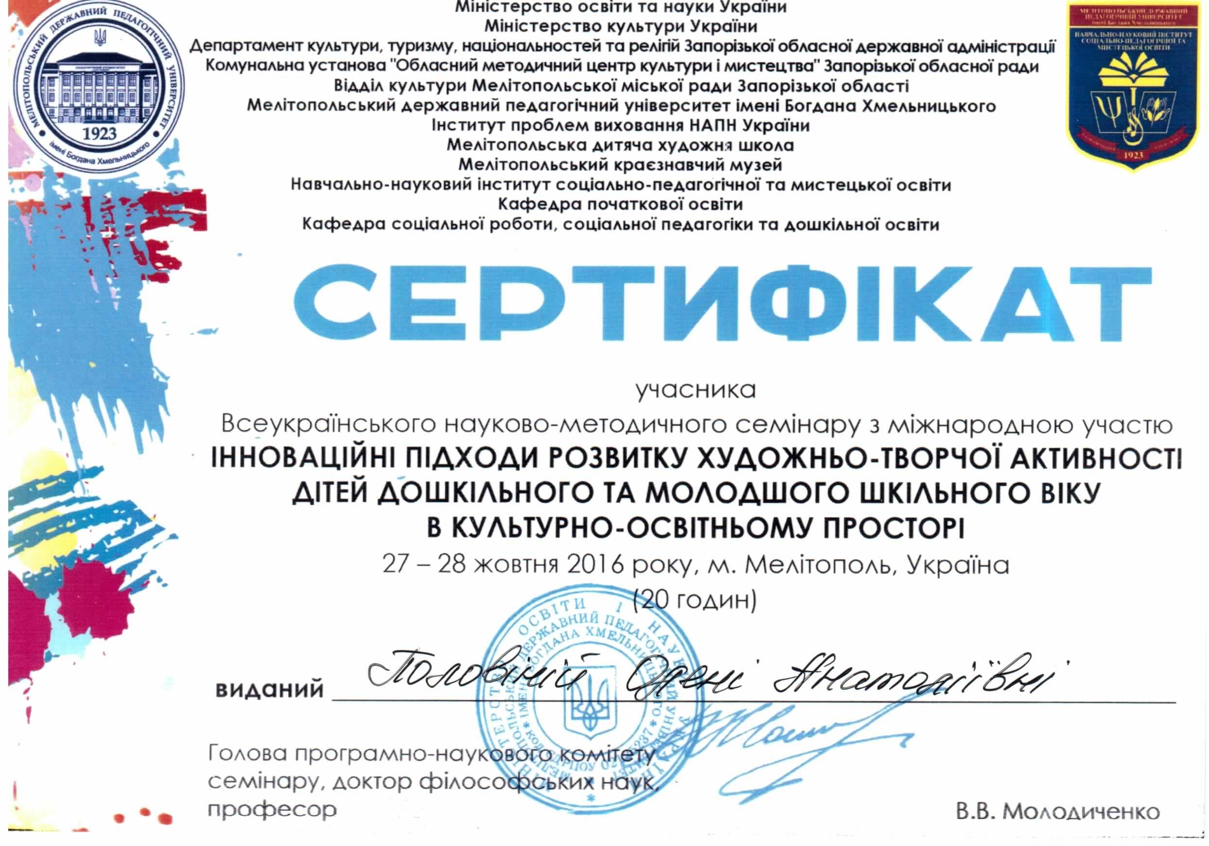 | 337 | Методичний семінар «Формування емоційного відгуку на красу природи у дітей молодшого дошкільного віку в образотворчій діяльності | науково-методичний семінар | м. Київ | 17.11.2016 00:00 | 2 |