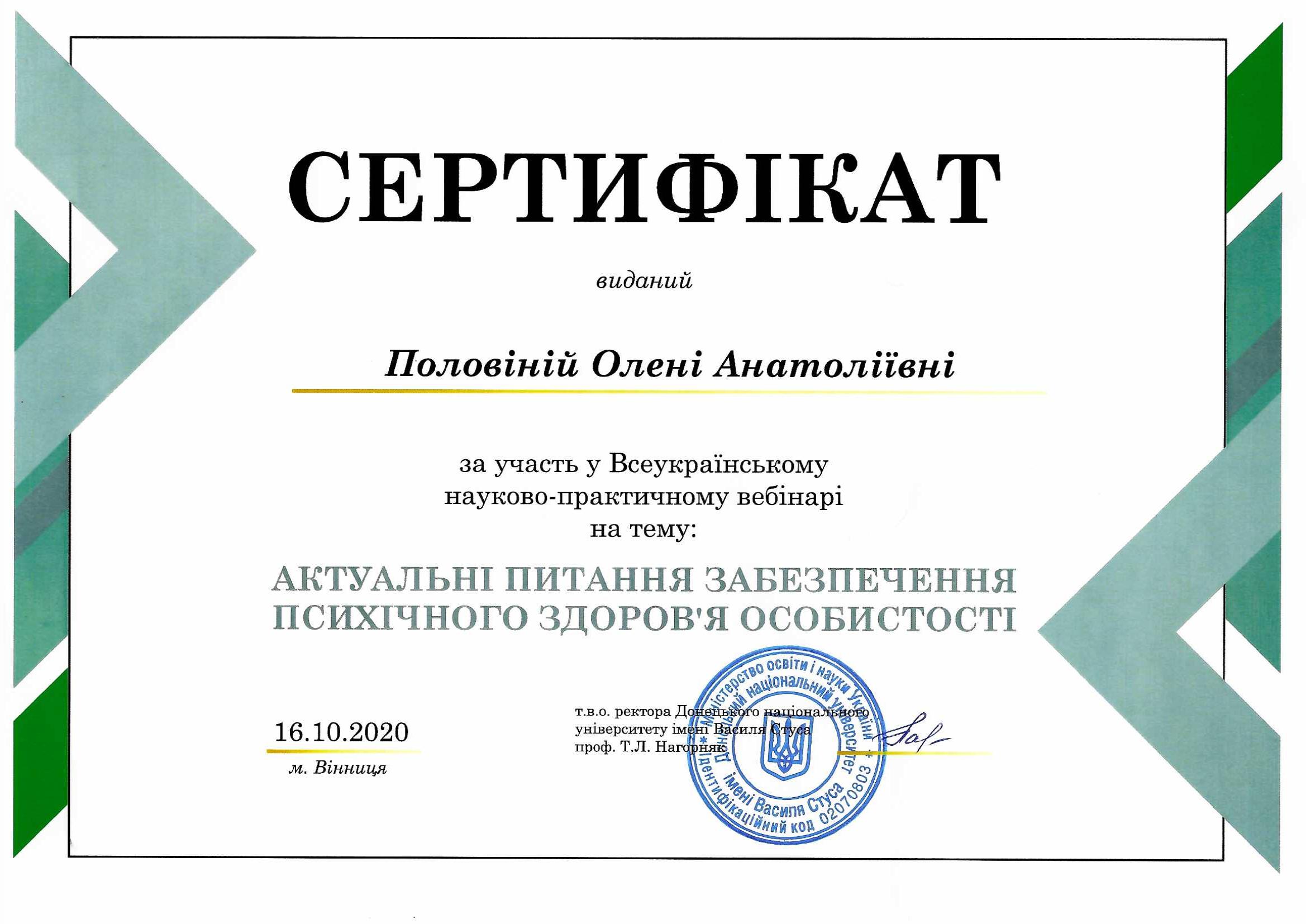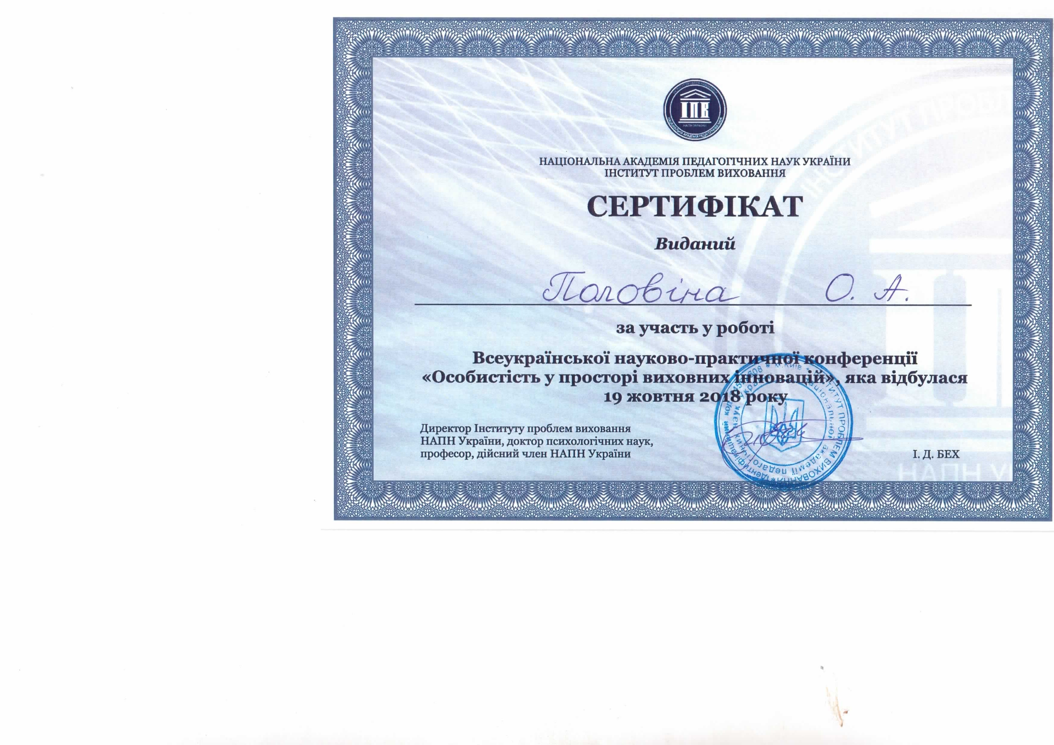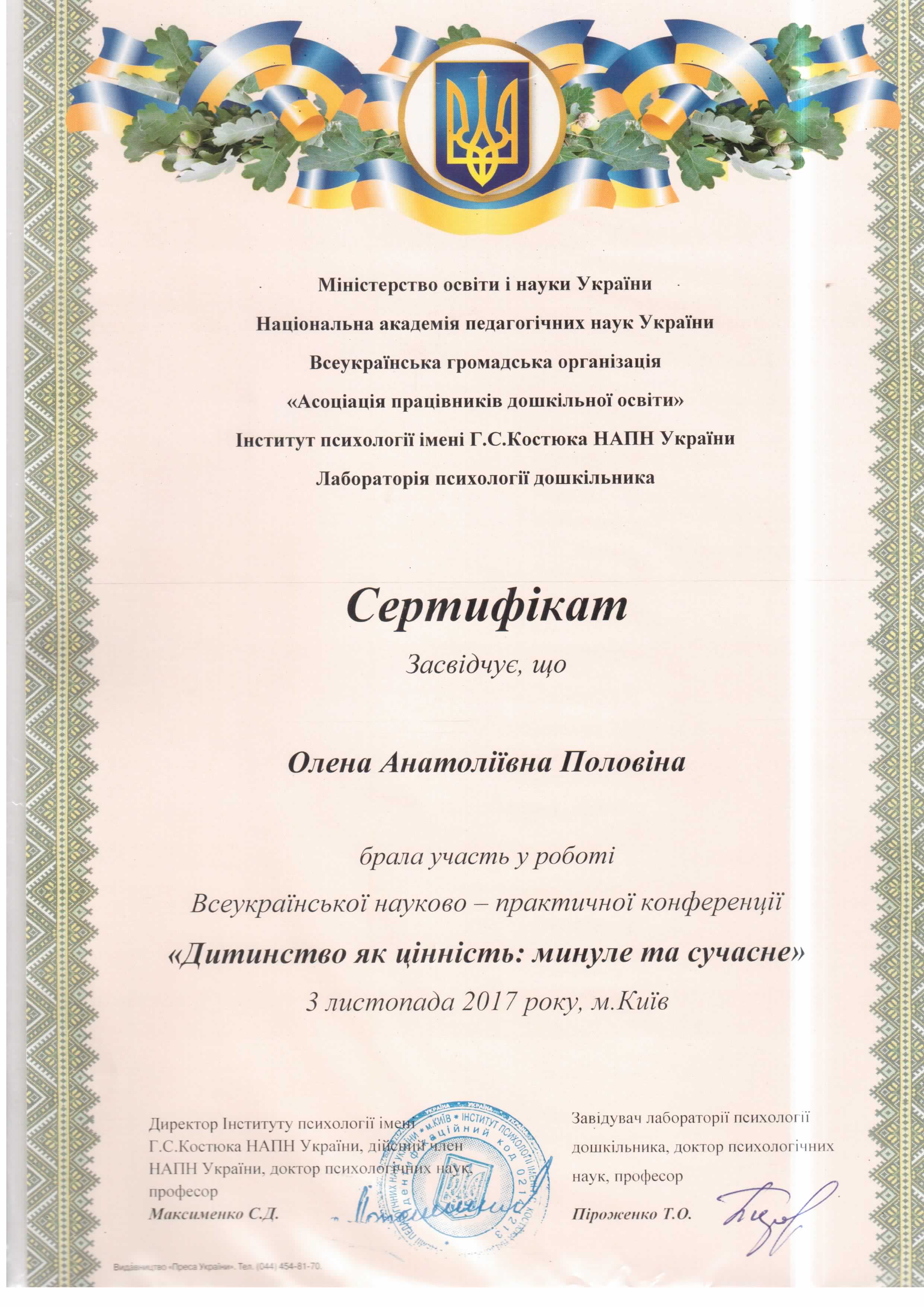 14. Участь (виступ «Забезпечення екології батьківсько-дитячих стосунків») у Всеукраїнській науково-практичній конференції з міжнародною участю «Психологічні засади розвитку, психодіагностики та корекції особистості в системі безперервної освіти» 29-30 жовтня 2021, м. Вінниця.