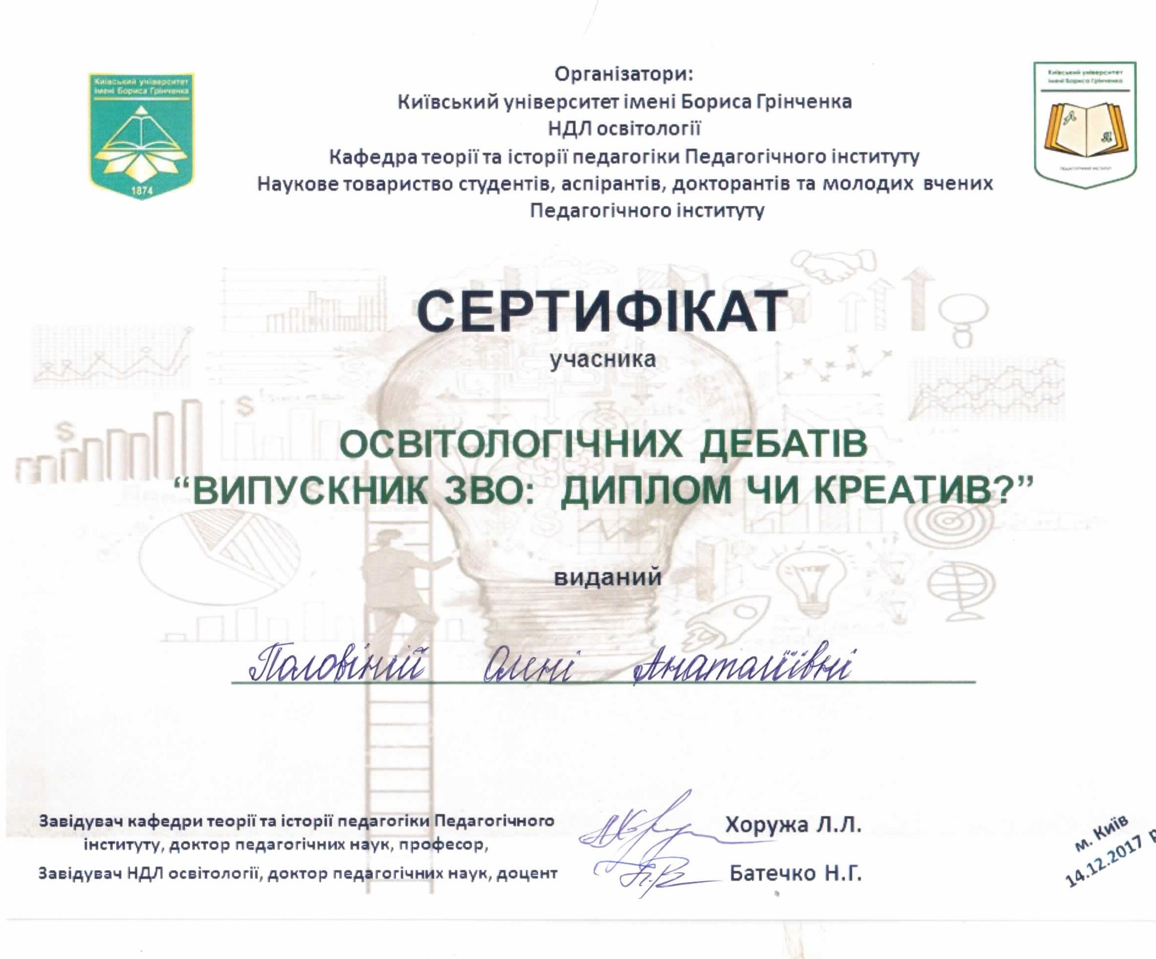 12. Співмодератор дискус-тренінгу «Підготовка дитини до НУШ: ліквідувати не можна змінити» у рамках освітнього заходу «НУШ-ФЕСТ», Київський університет імені Бориса Грінченка 16 листопада 2019 р.