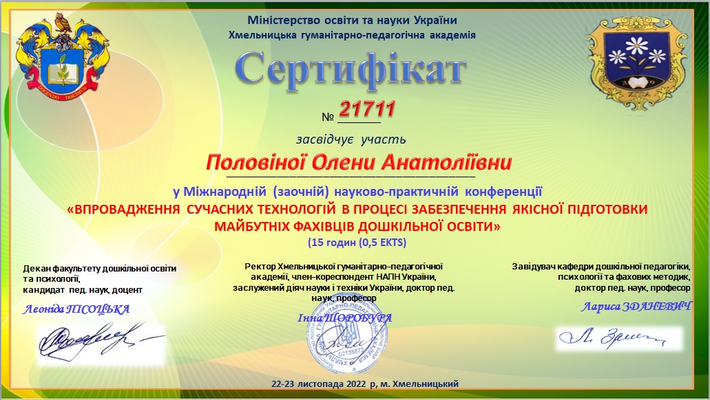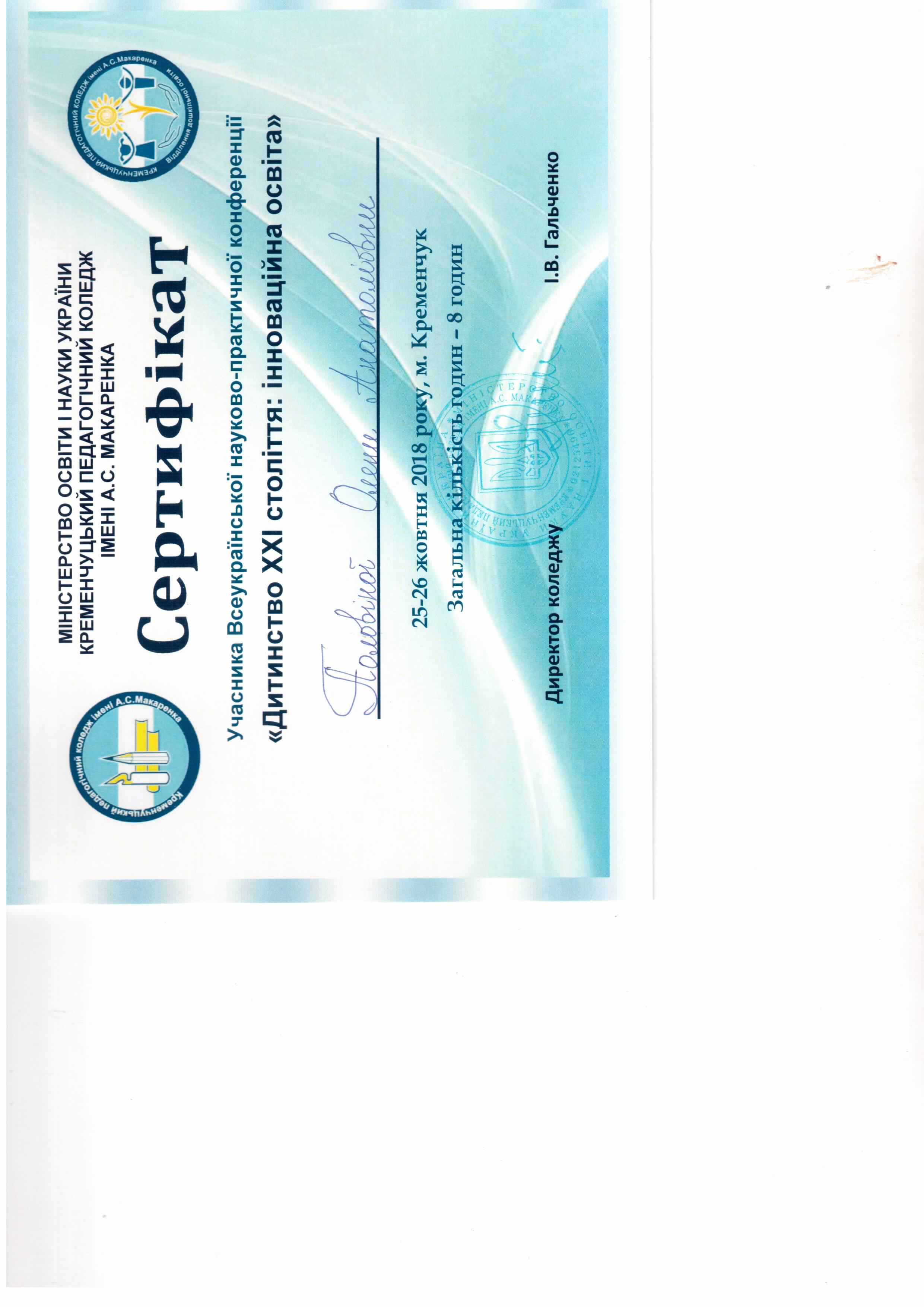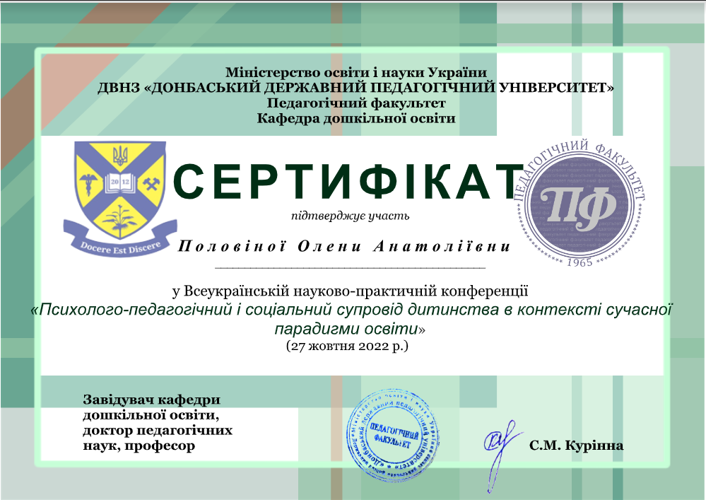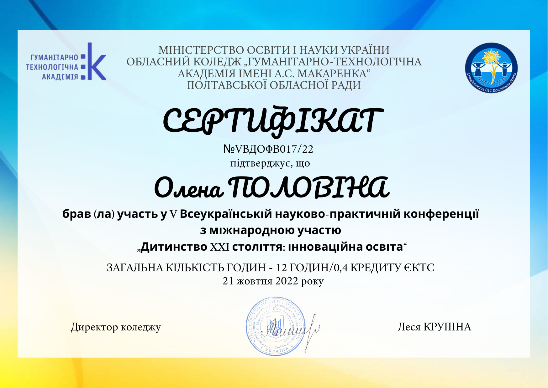 12.Участь (виступ) у ІV Всеукраїнській науково-практичній конференції «Дитинство ХХІ століття: інноваційна освіта», 22 жовтня 2021 року, м. Кременчук.