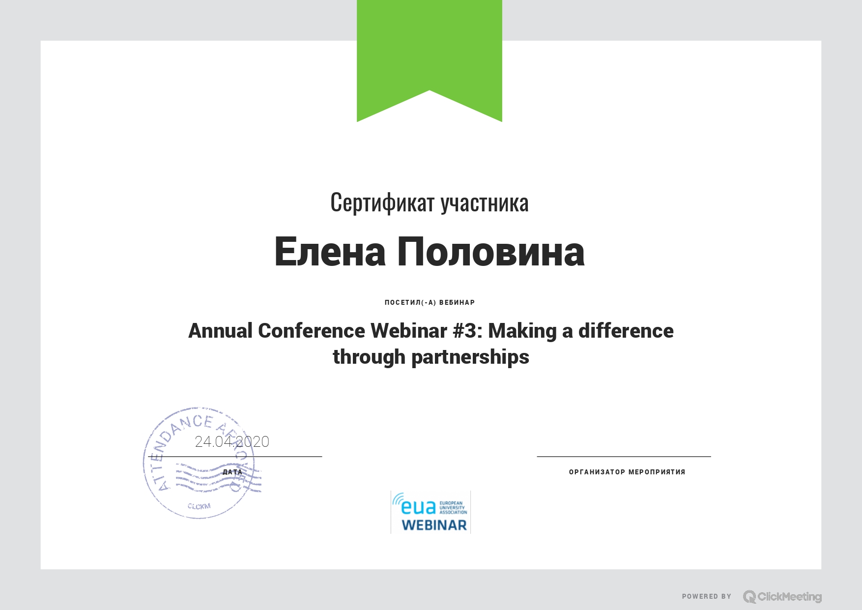 1. Спікер Всеукраїнського круглого столу «Інноваційна стратегія Базового компоненту дошкільної освіти (2021) – нова якість вищої освіти». 18 січня 2021 року, м. Київ