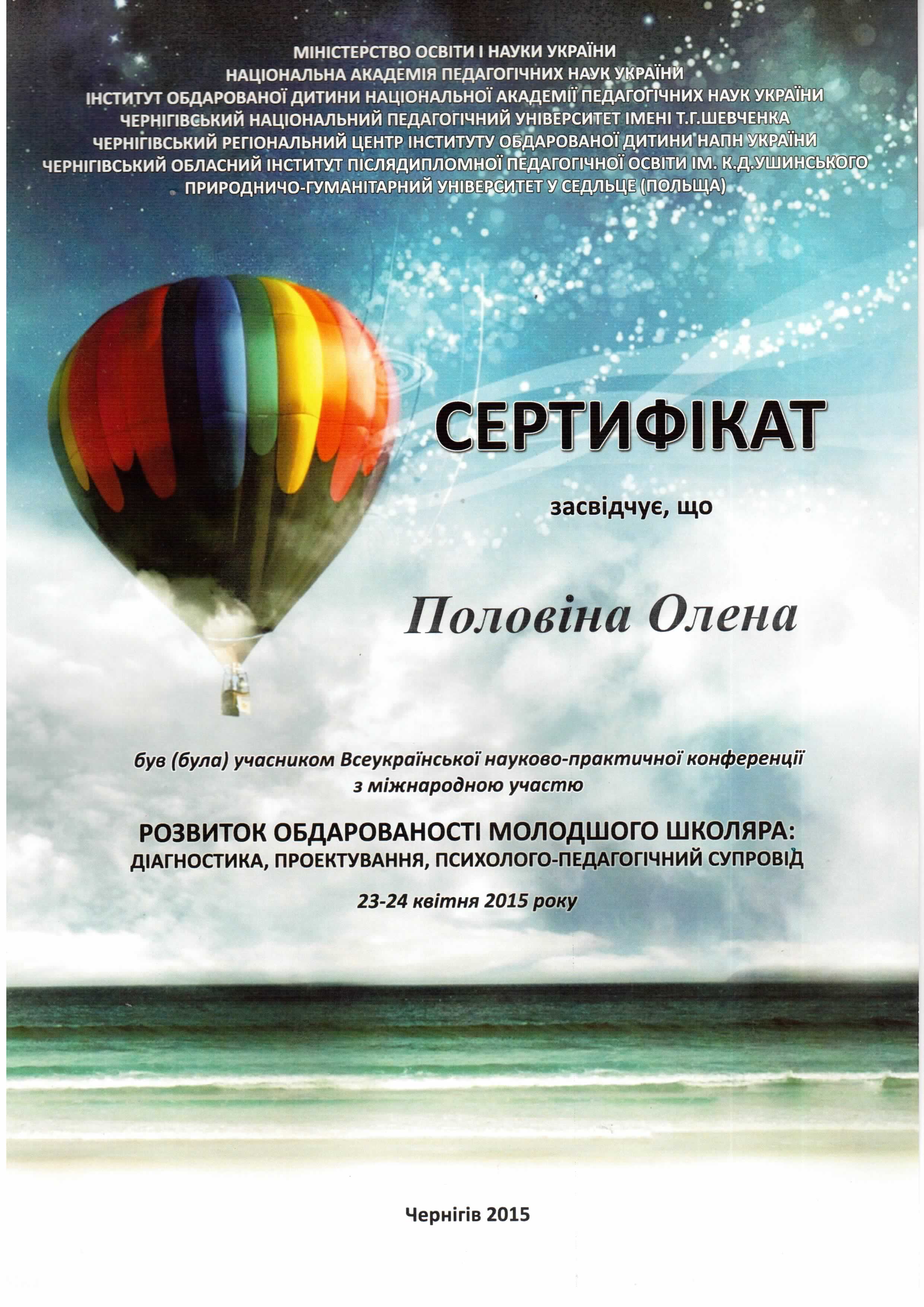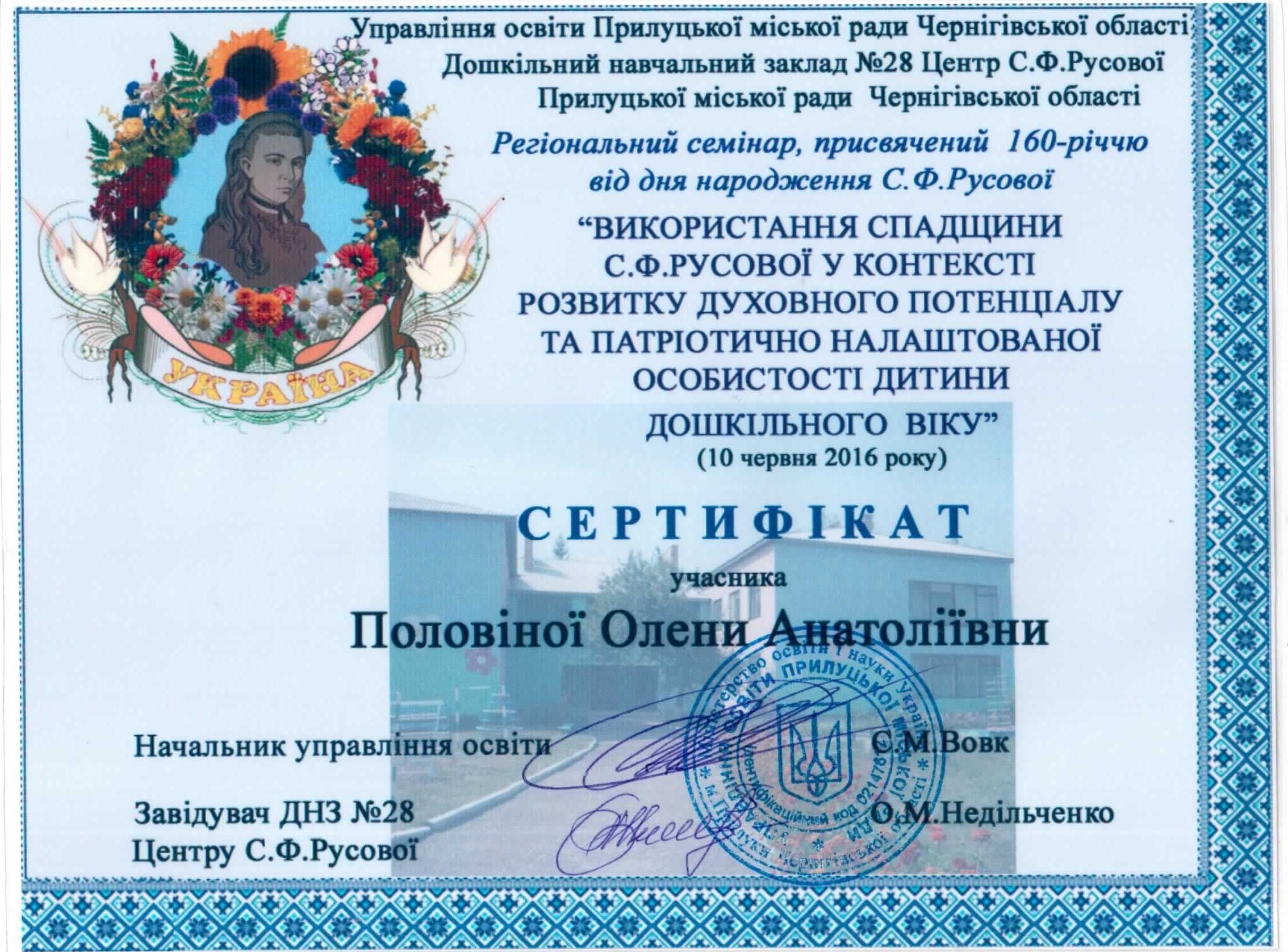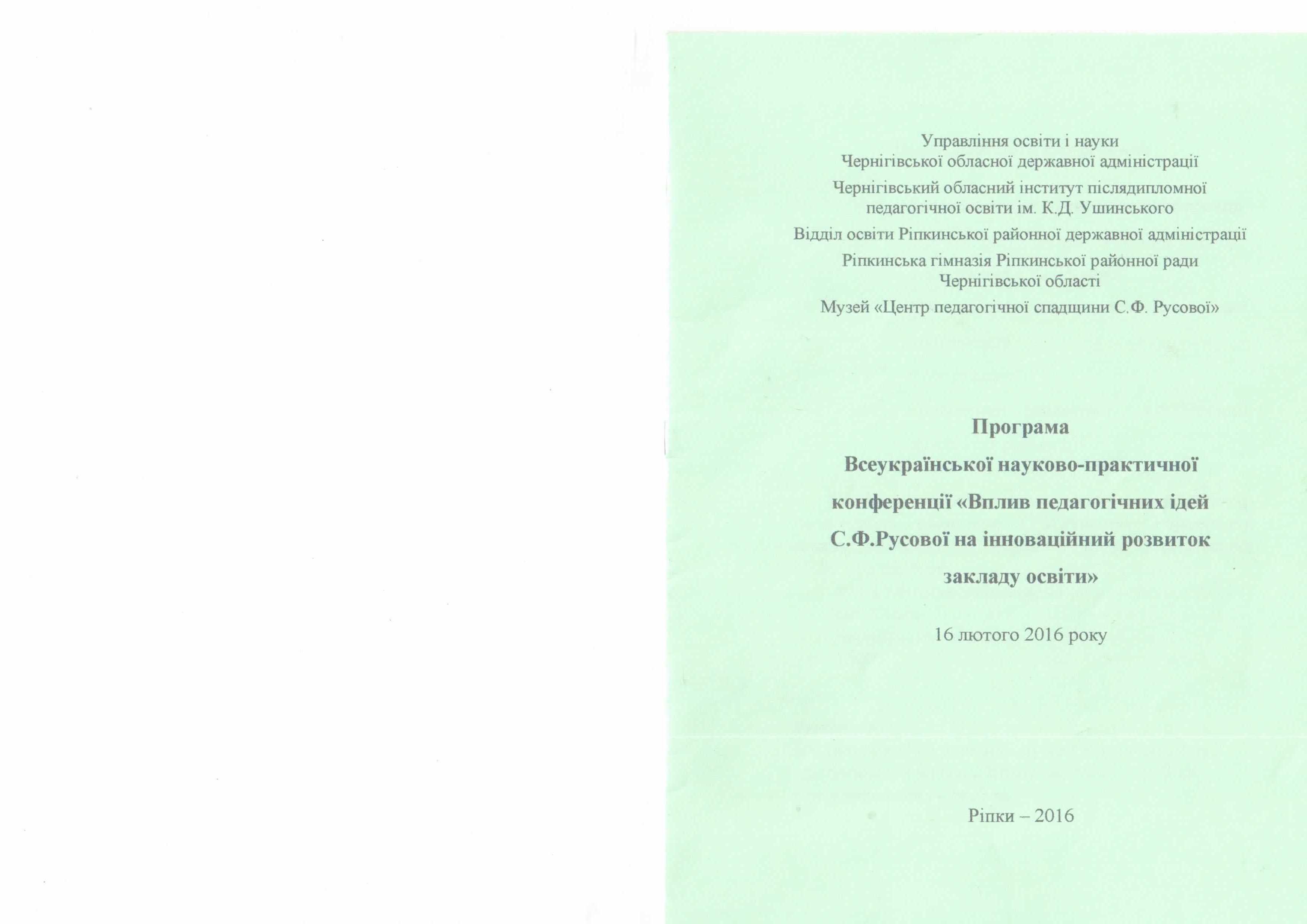 | 327 | Всеукраїнська науково-практична конференція «Вплив педагогічних ідей С.Ф. Русової на інноваційний розвиток закладу освіти» | науково-практична конференція | м. Ріпки | 16.02.2016 00:00 | 2 |