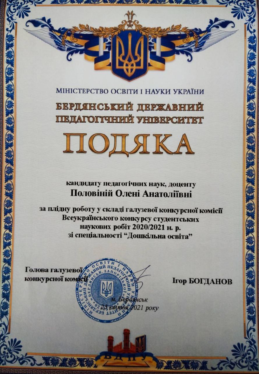 9. Член робочої групи з розроблення професійних стандартів стандарту «Вихователь закладу дошкільної освіти», «Керівник закладу дошкільної освіти». Наказ МОН України №440 від 20.04.2021р.