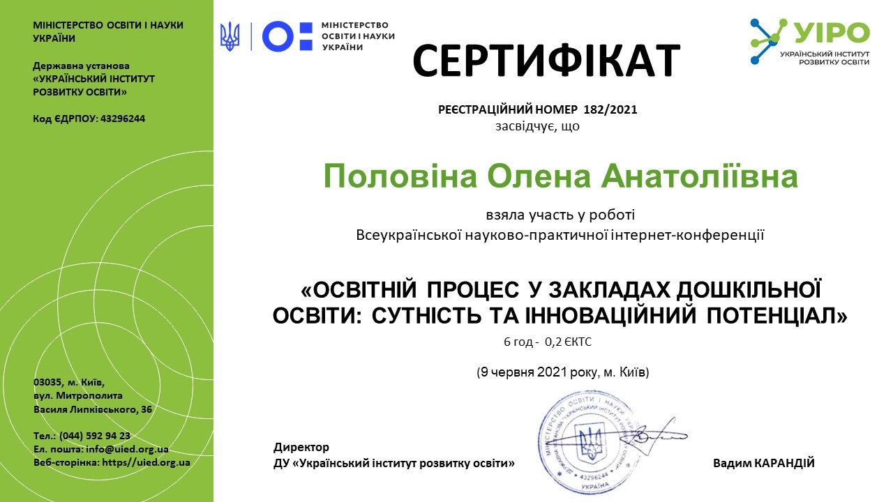 15. .Виступ. Всеукраїнський педагогічний марафон «Інновації в освітньому процесі закладів дошкільної освіти», Інституту проблем виховання НАПН України (13 – 16 грудня 2021р.), Київ. 2021
