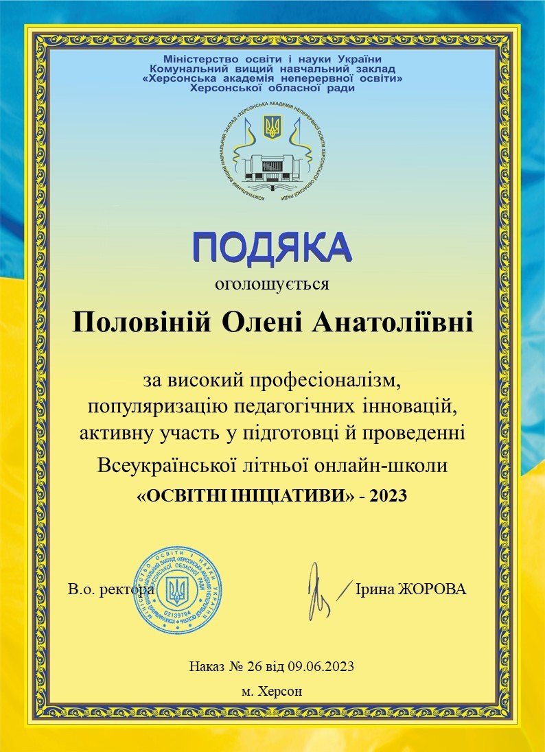 7. Спікер Всеукраїнської Літньої онлайн-школи «Освітні ініціативи» – 2023, тема «Артосвіта дітей дошкільного віку – сходинки почуттєвого досвіду», Херсон, 9 червня 2023 року