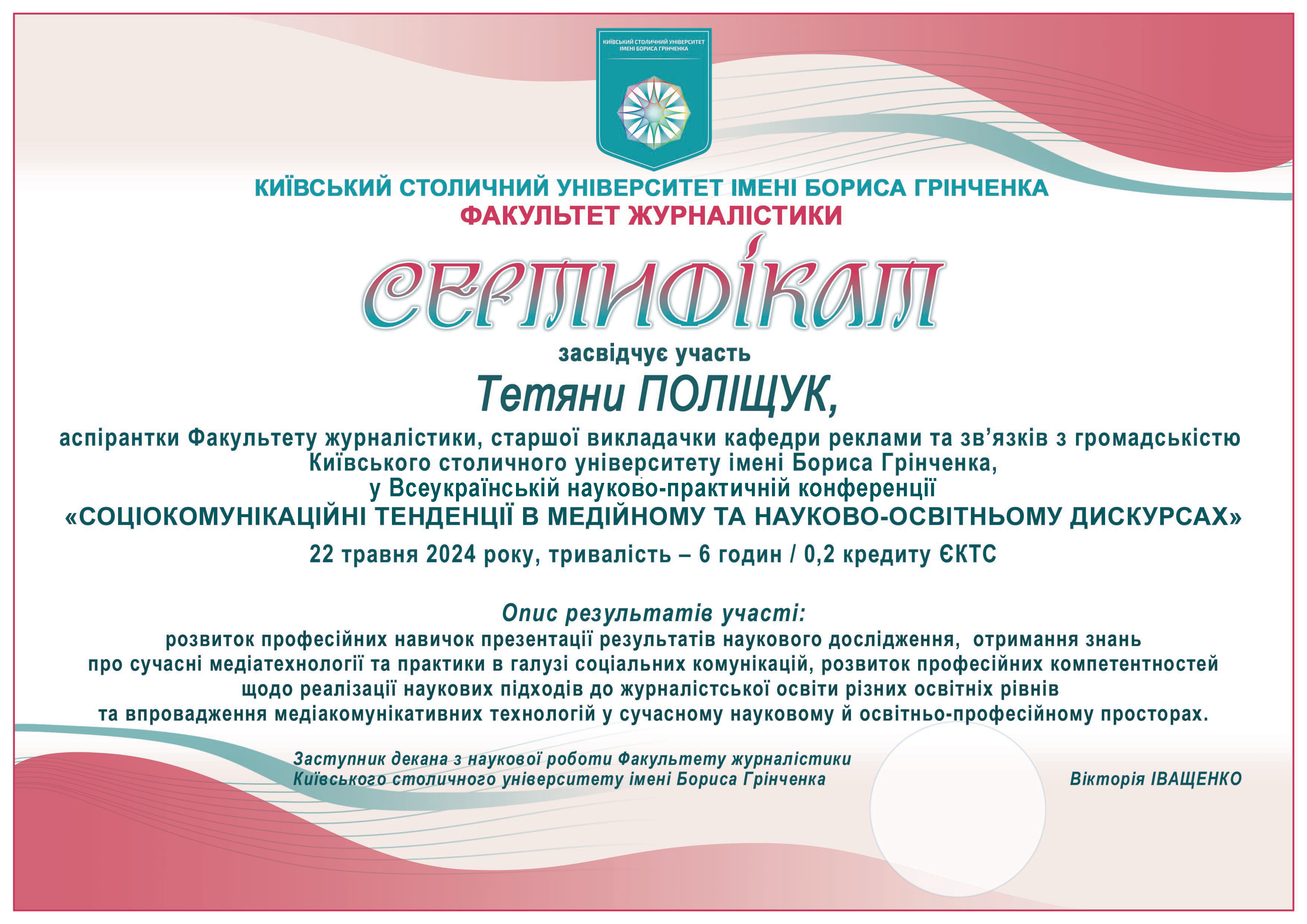 | 483 | Факультет журналістики | Кафедра реклами та зв'язків з громадськістю | 21.2 | 0 | 2024 | https://www.researchgate.net/profile/Tetiana_Polishchuk |