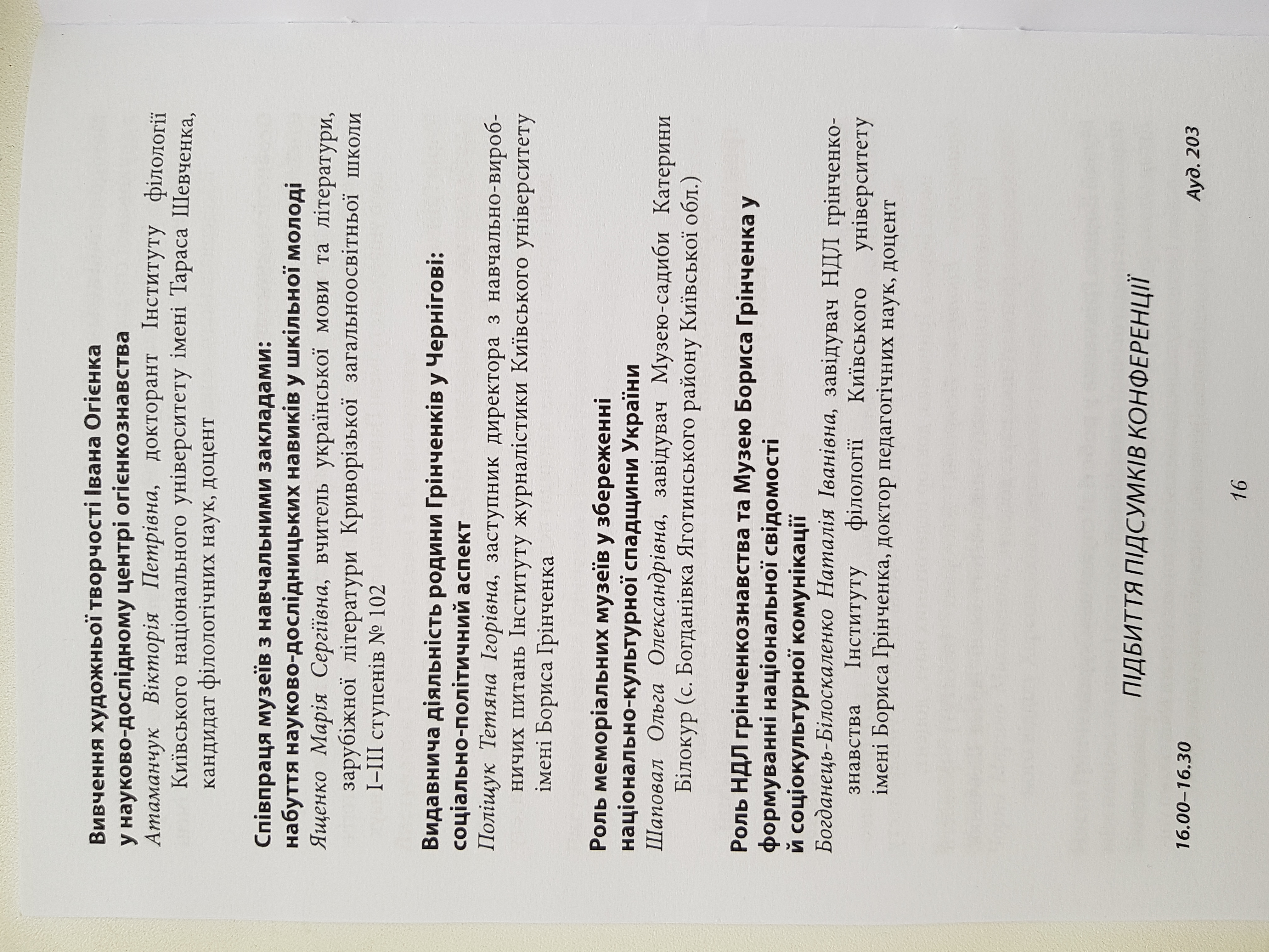 | 2859 | Всеукраїнська наукова конференція (Х Грінченківські читання). \ | Видавнича діяльність родини Грінченків у Чернігові: соціально-політичний аспект | м.Київ |