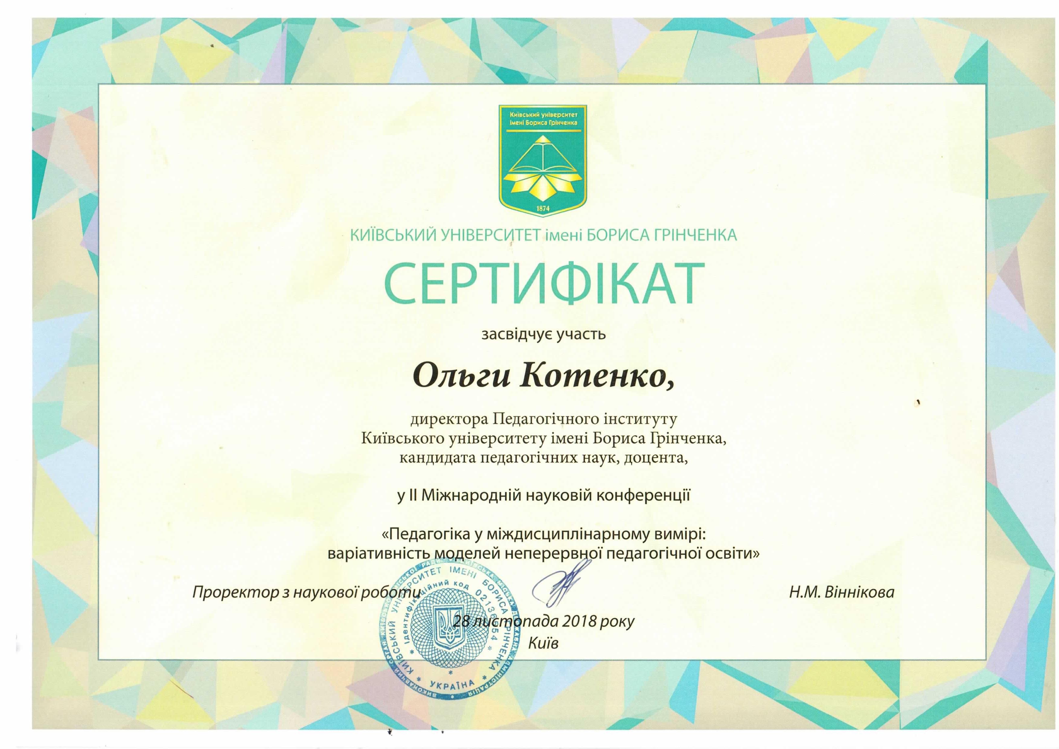 | 1254 | "Професійна підготовка педагогів в умовах євроінтеграції: проблеми та перспективи" | Всеукраїнська науково-практична конференція | Київський університет імені Бориса Грінченка | 12.10.2017 00:00 | 5 |