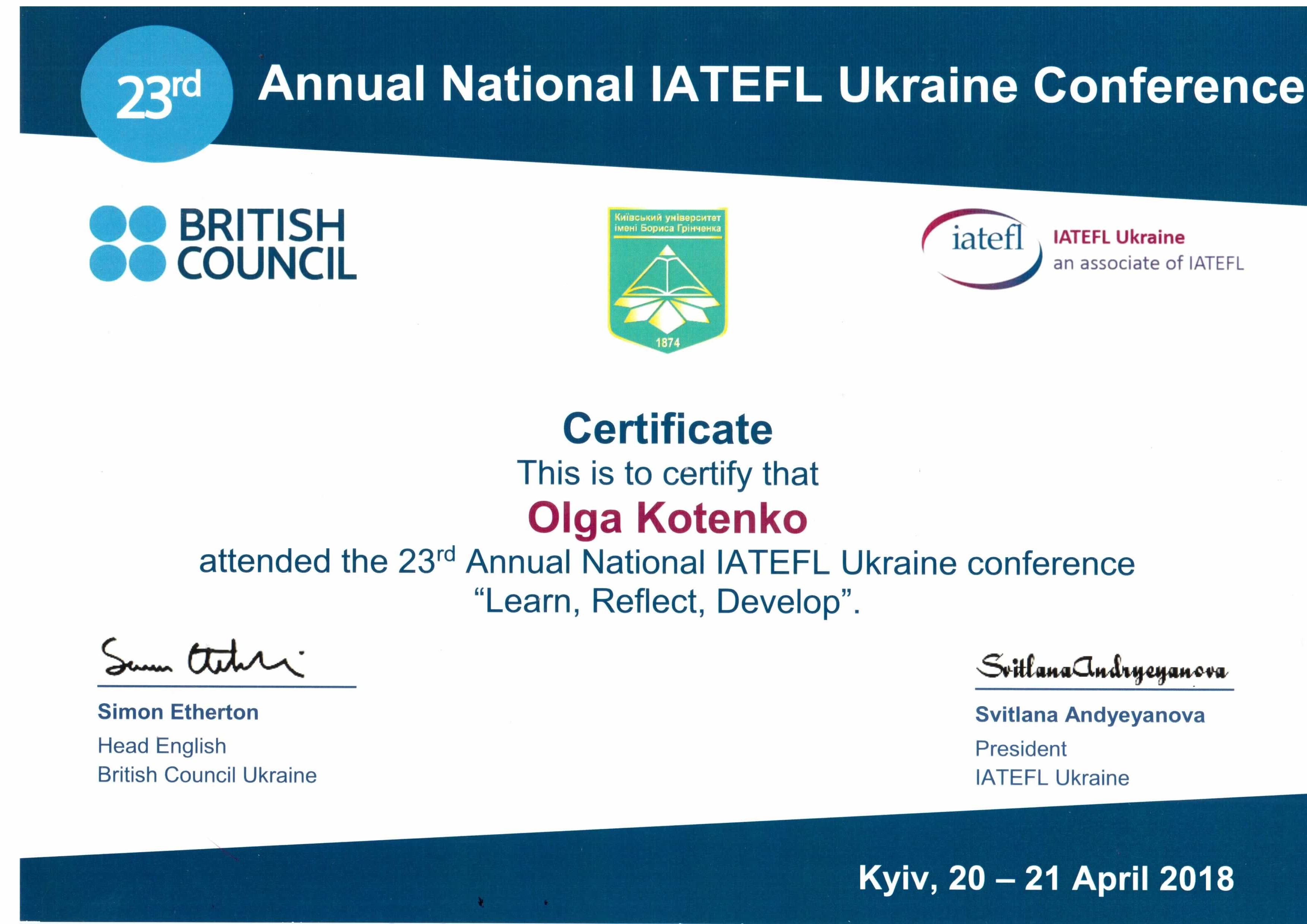 | 3643 | The 23 rd Annual National IATEFL Ukraine conference "Learn, Reflect, Develop" | - | Kyiv, Ukraine |