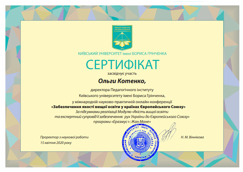 | 5264 | Міжнародна науково-практична онлайн-конференція «Забезпечення якості вищої освіти у країнах Європейського Союзу (За підсумками реалізації Модулю «Якість вищої освіти та експертний супровід її забезпечення: рух України до Європейського Союзу» програми «Еразмус+: Жан Моне»)» | Якість вищої педагогічної освіти: європейський досвід, українські реалії | Київський університет імені Бориса Грінченка (система онлайн-вебінарів і вебконференцій Cisco Webex Meetings) |