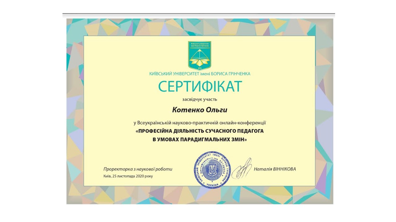 | 5907 | Всеукраїнська науково-практична онлайн-конференція "Професійна діяльність сучасного педагога в умовах парадигмальних змін" | - | Київський університет імені Бориса Грінченка |