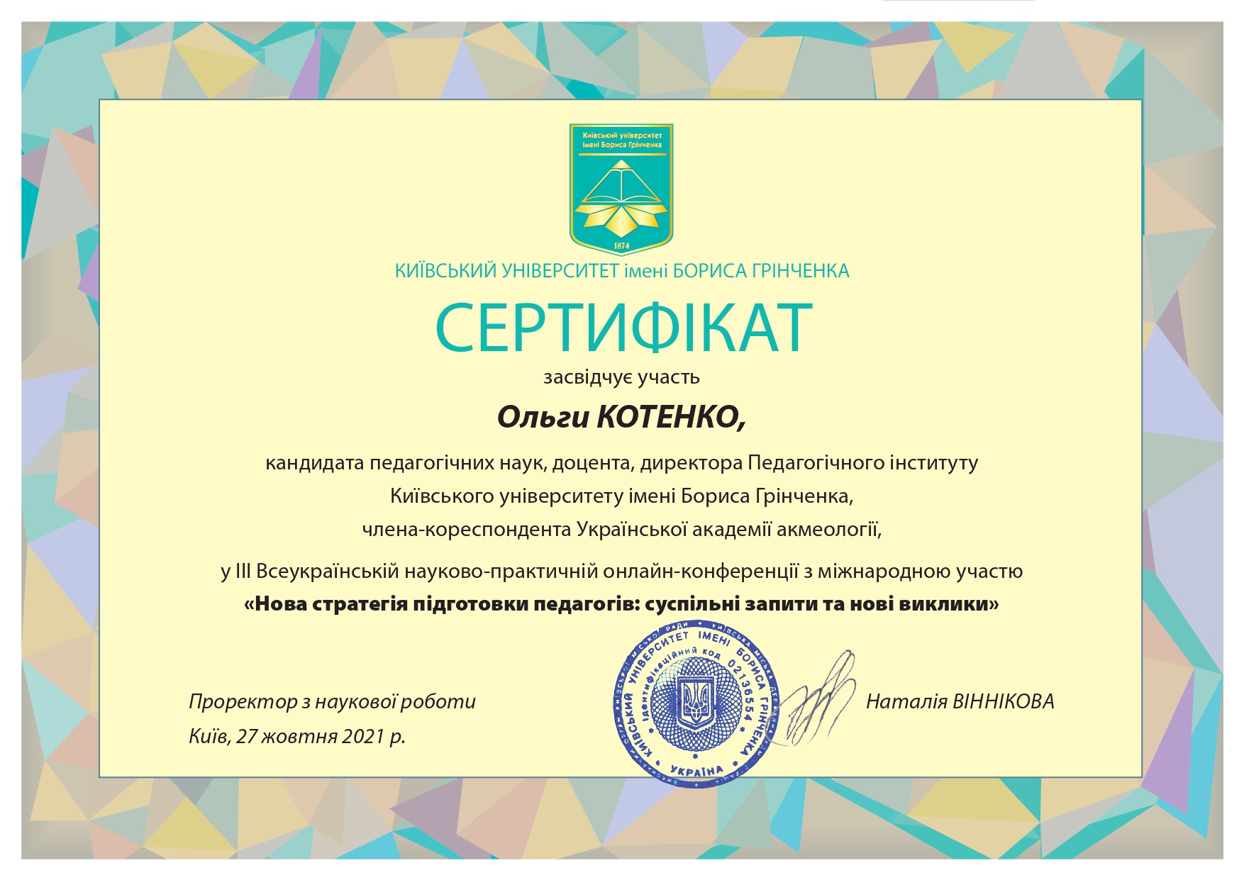 | 11366 | V Міжнародна наукова онлайн конференція «ПЕДАГОГІКА У МІЖДИСЦИПЛІНАРНОМУ ВИМІРІ: РЕАЛІЇ ВИЩОЇ ОСВІТИ У КОНТЕКСТІ ВИКЛИКІВ СЬОГОДЕННЯ» | Упровадження травма-інформованого підходу в освітній процес закладів вищої освіти: стан, проблеми, перспективи. | Київський університет імені Бориса Грінченка | document.pdf | |