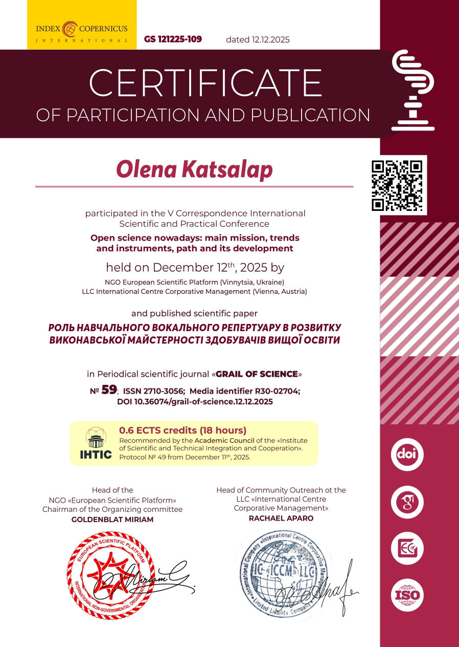 | 188 | Факультет музичного мистецтва і хореографії | Кафедра академічного та естрадного вокалу | 3.3 | 0 | 2025 | https://www.researchgate.net/profile/Olena_Katsalap |