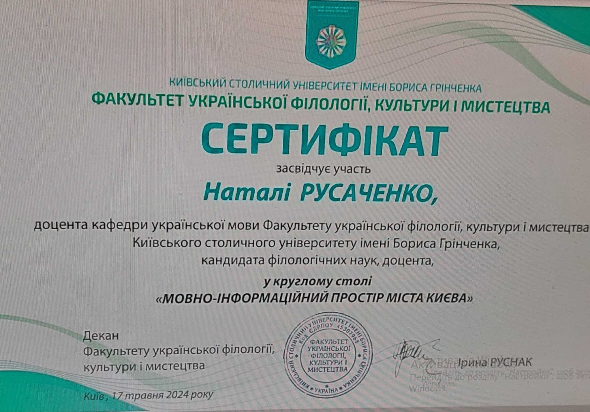 Відповідальна за соціальний проєкт Київського університету імені Бориса Грінченка "З Києвом і для Києва" від кафедри української мови Науково-дослідна та міжнародна діяльність