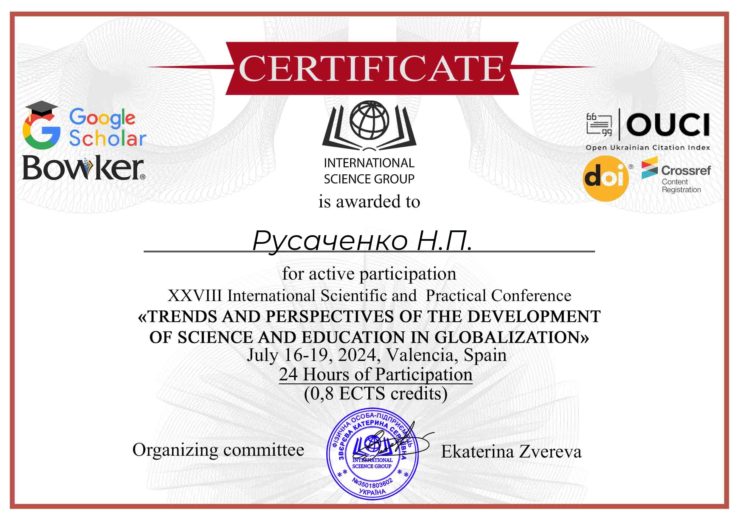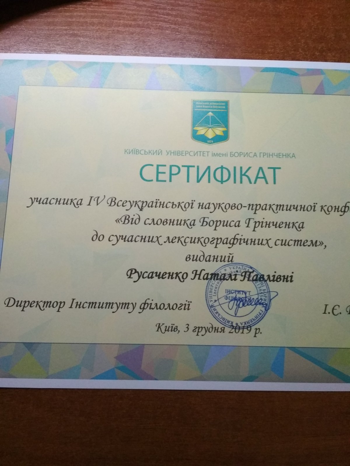 | ID | Назва | Тема доповіді | Місце проведення | Документ, що засвідчує | Дата проведення |