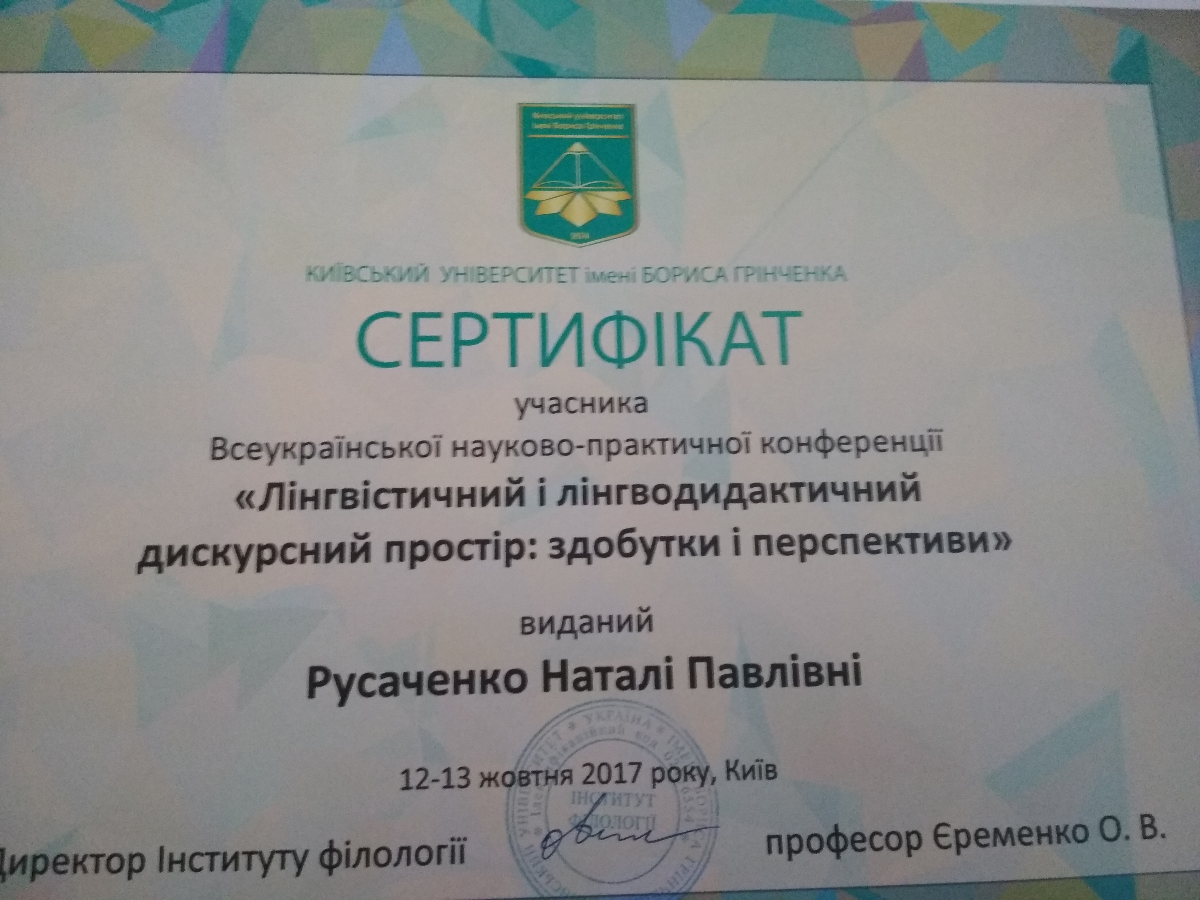 | 2951 | Всеукраїнська науково-практична конференція "Лінгвістичний і лінгводидактичний дискурсний простір: здобутки і перспективи" | Чергування задньоязикових приголосних у староукраїнській мові другої половини ХVІ – першої половини ХVІІІ ст. | м.Київ |