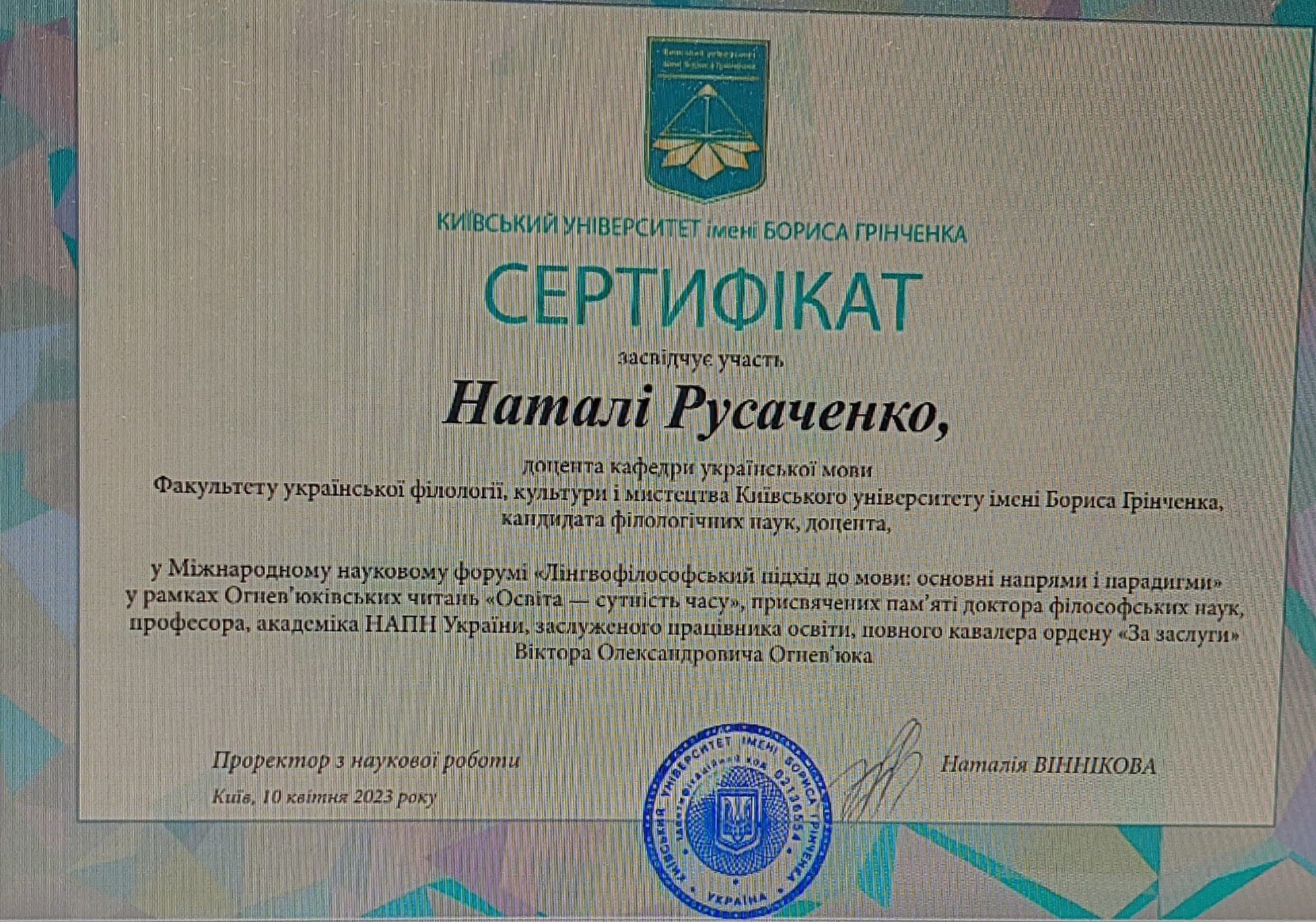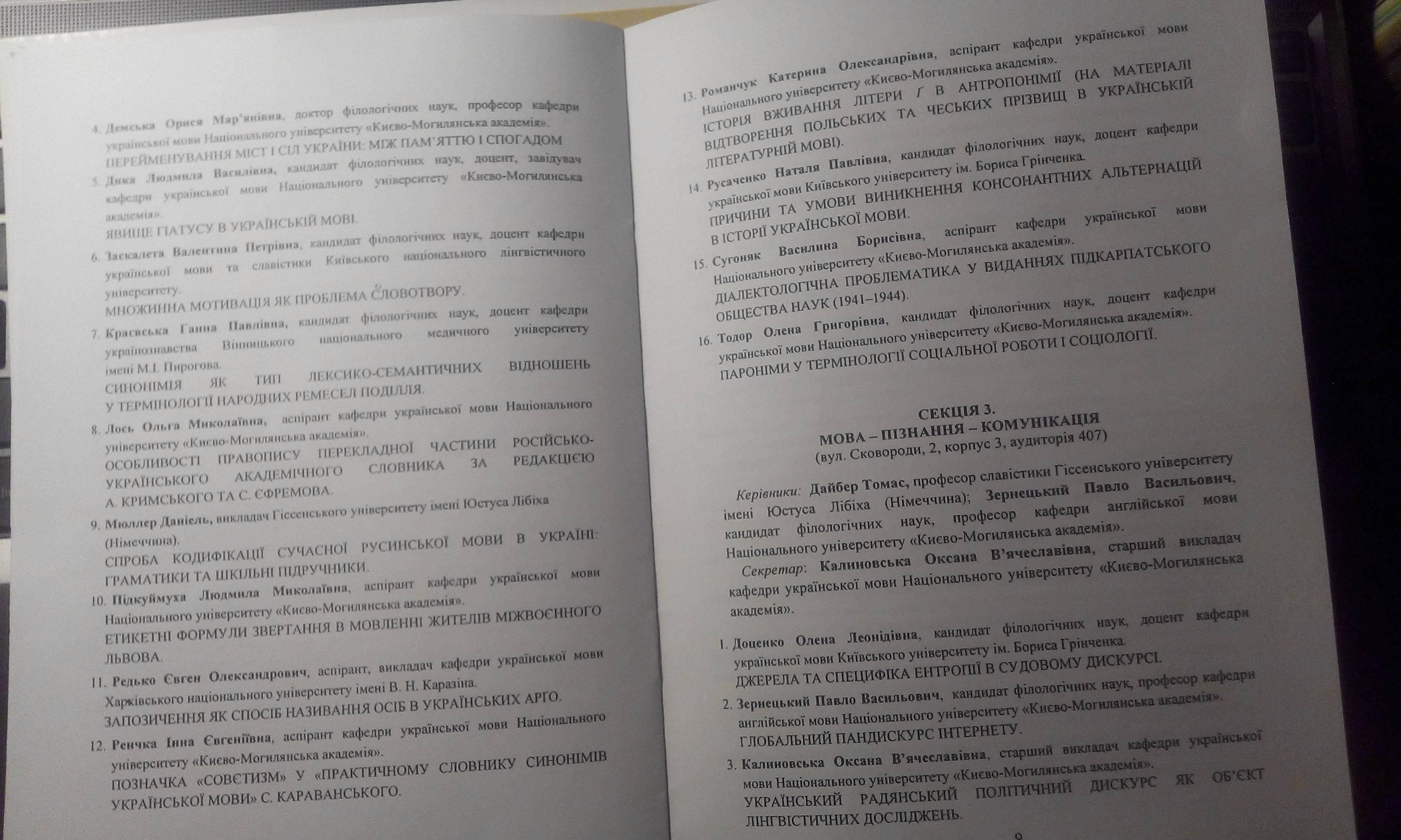 | 9676 | Міжнародний науковий форум «Лінгвофілософський підхід до мови: основні напрями і парадигми» | Історія морфонологічних засобів морфемного варіювання в українській мові | Київ |